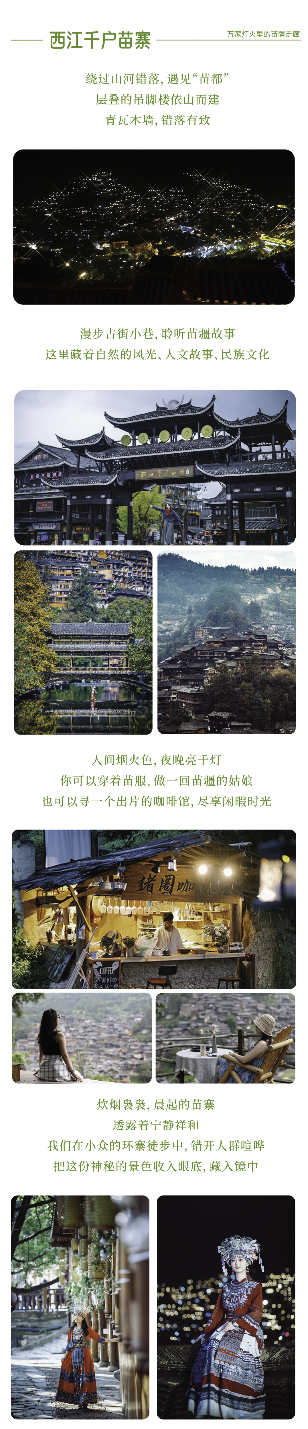 夜晚的西江是顶漂亮的,万千灯火之下像极了宫琦骏的千与千寻。在如此美妙的世界里,怎么么可以不来上一组美美的旅拍大片呢?注:旅拍属自拍顶目,西江苗寨内有特别多的旅拍点,价格从99-599不等,大家根据自己的需求购买;