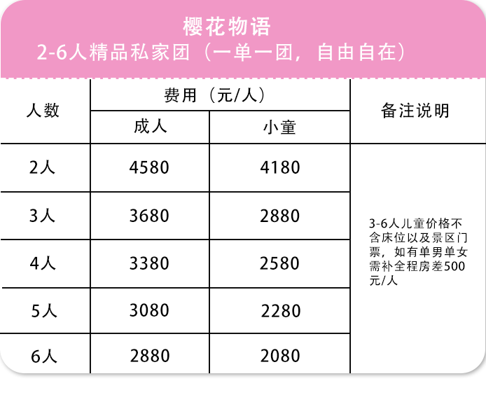 房差:单人报名默认同性拼房(拼房不成功无需另付单房差);指定单住或不愿意拼房(需补全程4晚单房差价共计:平日500元/)、1成人带1儿童时(儿童必须得占床位),2人一起报名默认住1间房(如需分开住请主动说明)。
