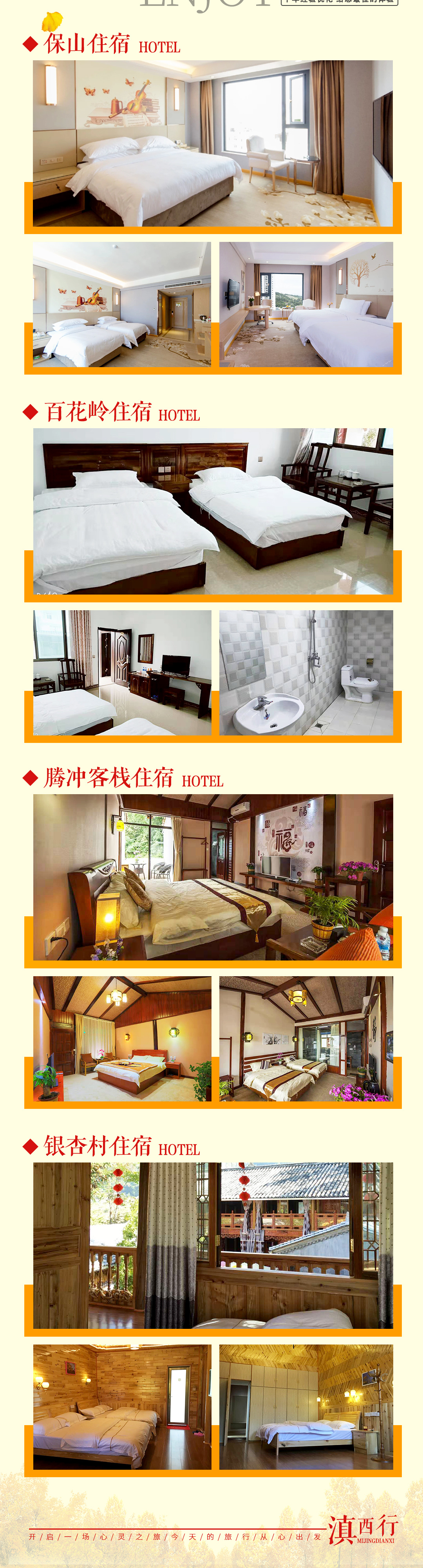 2、全程住宿费4晚(保山携程四钻酒店1晚,百花岭优选民宿1晚,腾冲特色客栈1晚,和顺古镇特色客栈1晚);