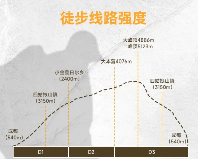中午12:00-13:00在【成都百草路地铁站A口】集合出发,路上途径卧龙,翻越巴郎山,天气好可观赏巴郎山云海,穿越巴郎山隧道,到达猫鼻梁观景台,在这里可以观赏到四姑娘山全景,与四姑娘拍照留念,最后抵达小金县,全程不堵车情况下5h抵达目的地。