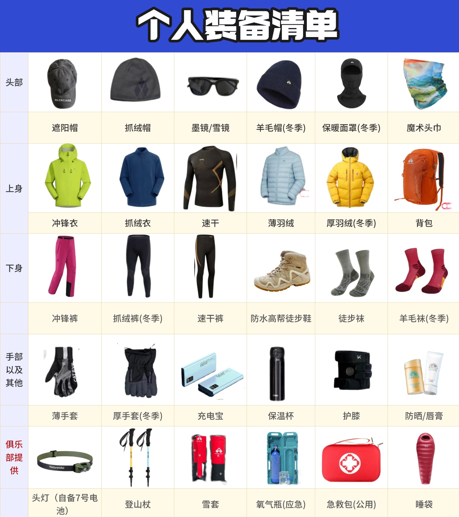 🎒背包:大背包 (30L-50L)放衣物和物资 + 小背包( 20L-30L)在冲顶当天带必备干粮和水;俱乐部会让马帮帮你把大背包驮到大本营,所以全程只需要背小背包