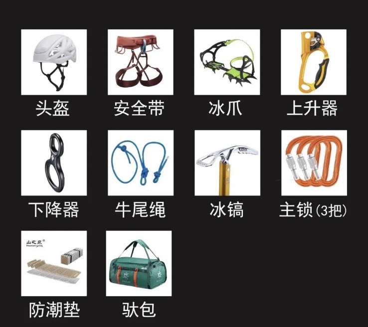 提供装备使用:5.装备:冰爪、头灯、登山杖,睡袋,安全带、上升器、下降器、 头盔等技术装备