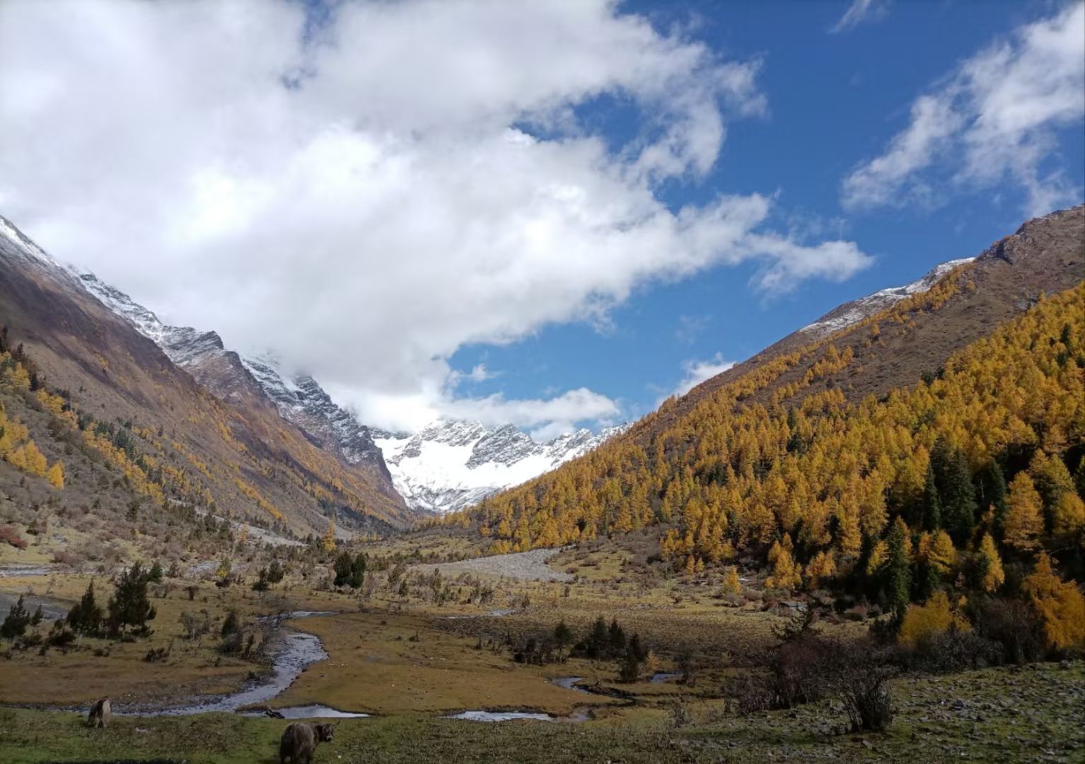木尔寨沟属夹金山国家森林公园的一部分,高山草甸、深山峡谷、原始森林、雪山、冰川、海子、林中溪流、枯木,以及藏于林间的牧场,山间游走的羊群和牦牛,构成一幅幅美妙绝伦的风景画,令人向往,让人留恋。