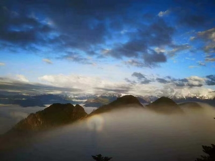 ▶早起迎接第一缕曙光,因为娘娘山的日出,绝对值得你牺牲一点睡眠。5点半左右起床,徒步1.5小时左右到山顶小包岭(建议携带登山杖,单边4公里,爬升400米)(不想爬山的可客栈观景无需远行,推门即享日照金山视觉盛宴),东观云海日出、西照贡嘎金山,霞光万顷、佛光彩稠,四面云海、四面环山、景色迷人,此时此刻尽情领略娘娘山的美丽风景,继续消耗所有相机内存。在山顶合影留念,观景结束后返回客栈享用热腾腾的藏式早餐、