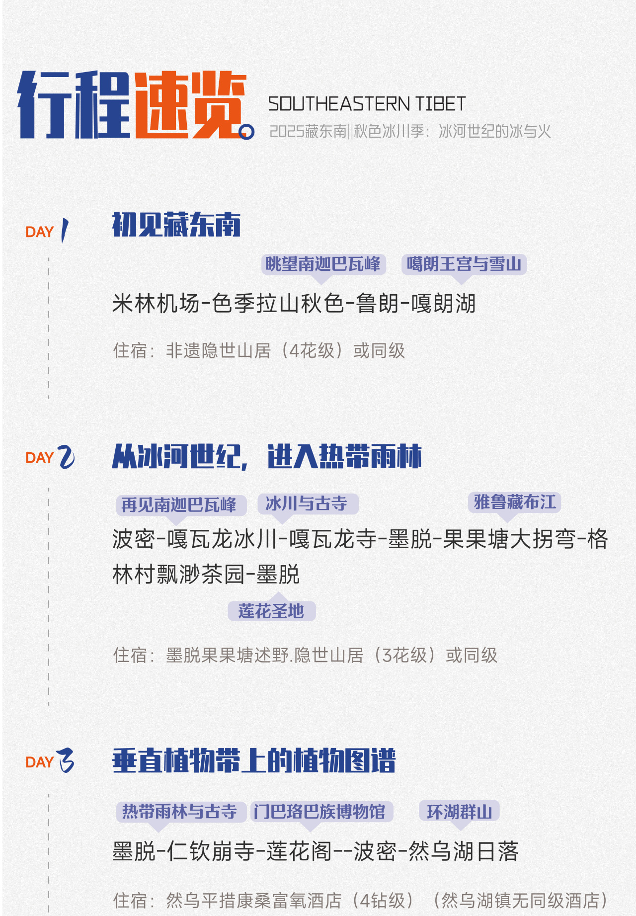 本行程聚焦藏东南核心景观,从林芝米林机场出发,串联色季拉山、南迦巴瓦峰、鲁朗、墨脱、然乌湖、冰川群、雅鲁藏布大峡谷等经典目的地,涵盖雪山、冰川、湖泊、雨林、茶园、古寺等多元地貌与人文景观,兼顾舒适住宿与深度体验,适合对藏东南自然与文化有较高探索需求的旅行者。旅行社经营许可成都环球国际旅行社有限公司 ,所有活动均保证签订国家旅游合同。