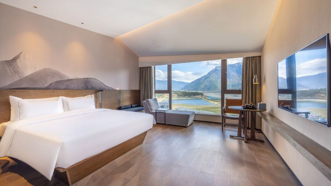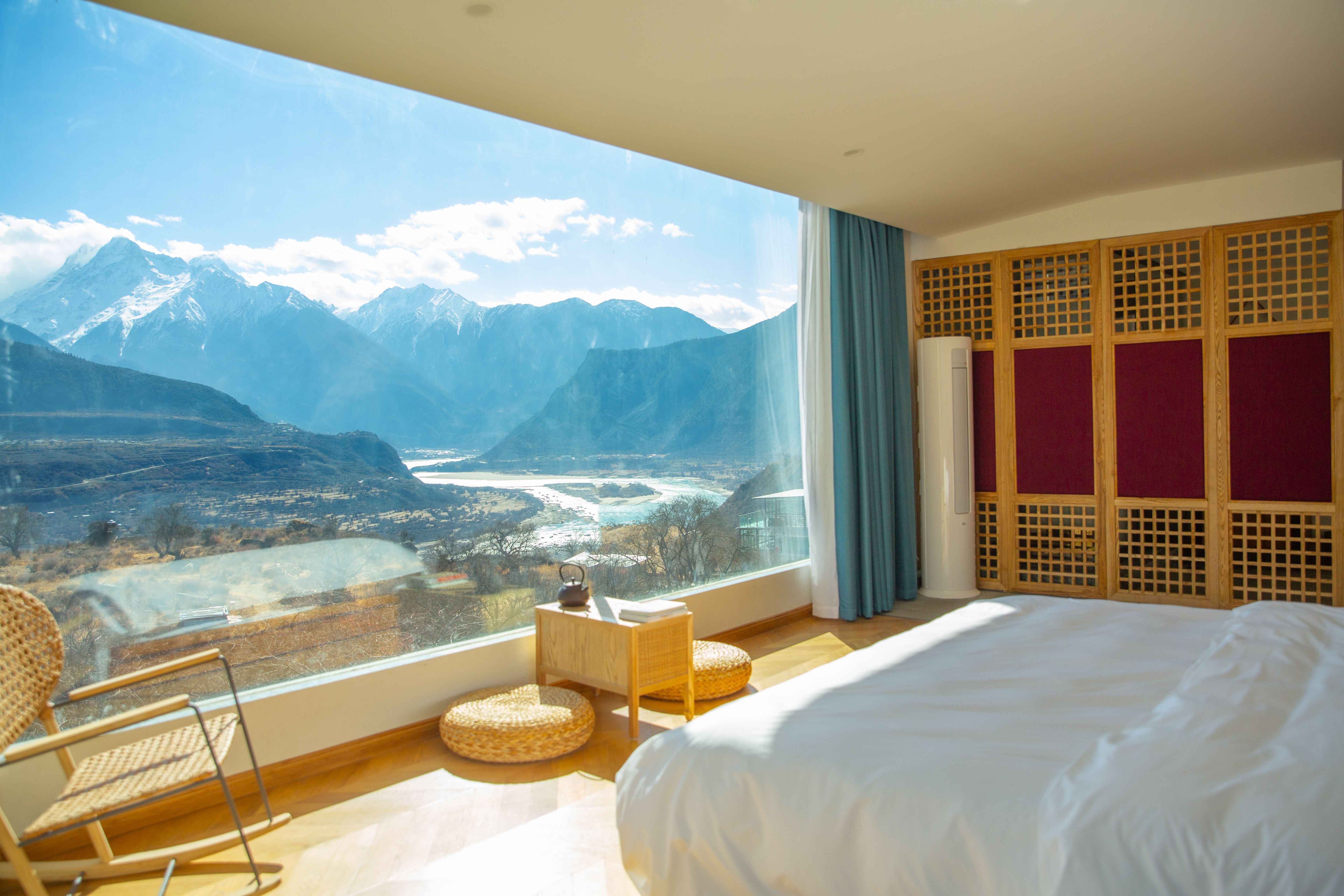 推窗不再是墙垣街市,而是帕隆藏布江湿地河谷铺陈开来,岗云杉林在远处肃立,清寂秀美的嘎朗湖如同一面天空之镜,倒映着古老的嘎朗王宫遗址和绵延雪山。