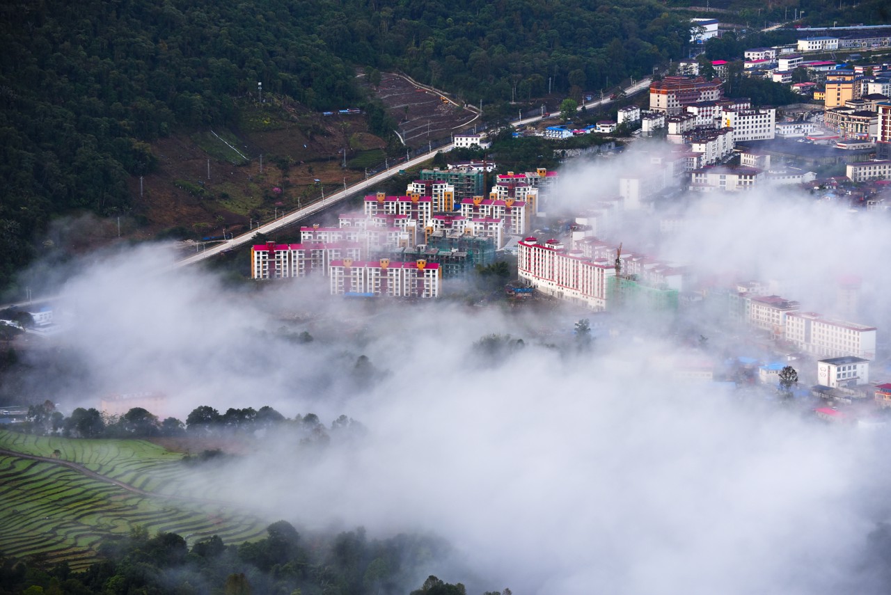 俯瞰墨脱县城,云雾之间若隐若现,宛如仙境。