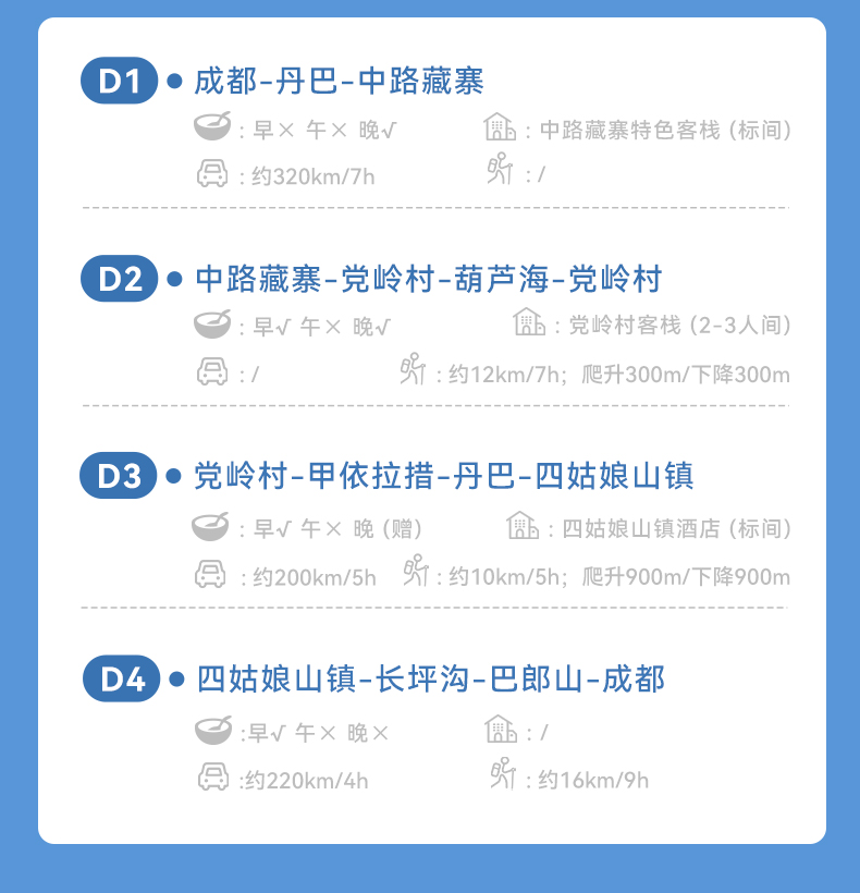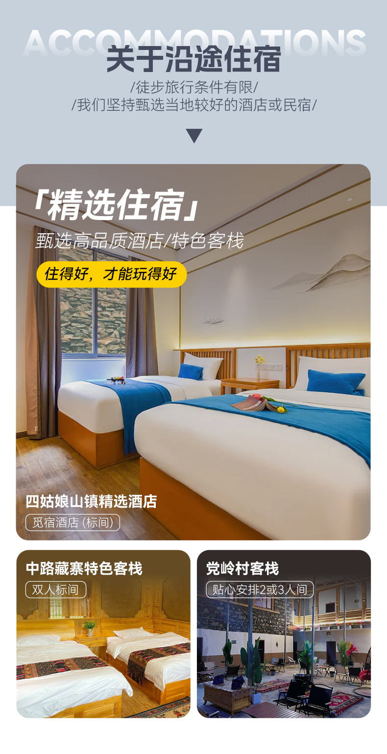 按行程所列标准入住: ①1晚中路藏寨特色客栈(双人标间) ②1晚党岭村客栈(2-3人间) ③1晚四姑娘山镇酒店(双人标间) (单独参加我们散客拼团活动,默认与其他同性拼房,如果无法拼房也无须另补房差) |