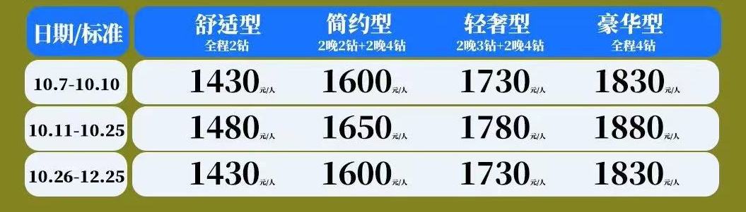 1、价格默认常规团期舒适型(全程2钻,供暖条件为电热毯)标间费用,其他团期费用参考小程序报价