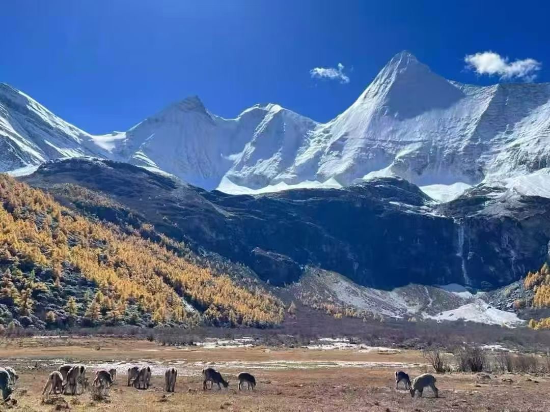 作为观看央迈勇和夏诺多吉两座雪山的最佳地点,洛绒牛场绝对是不可错过的打卡点。秋天的洛绒牛场,金黄的草甸上牛羊成群,远处的雪山在阳光下闪闪发光,仿佛置身于一幅美丽的油画中。