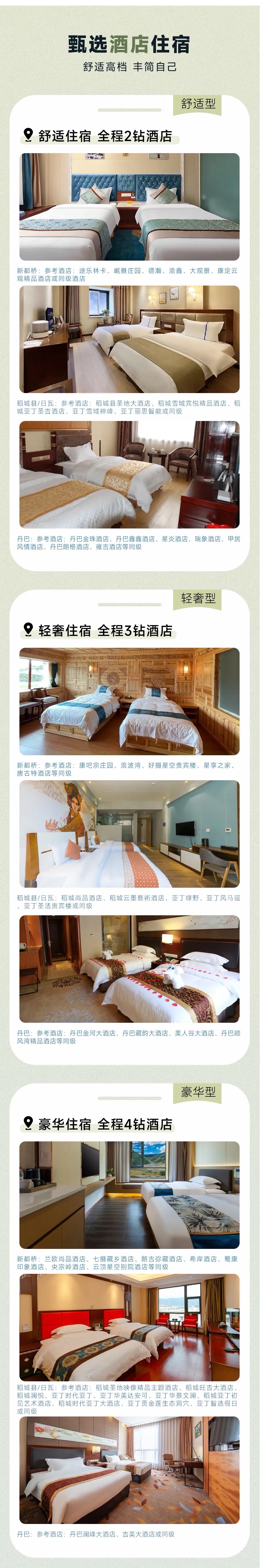日瓦:风马谣精品酒店、喆啡酒店、圣洁贵宾楼、稻城绿野亚丁酒店、稻城云墨藝術酒店、红景天大酒店、扎西岭珠或同级酒店
