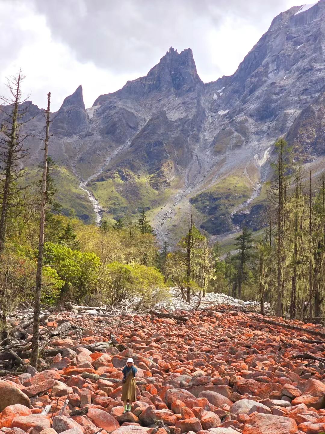 【红石滩】在大二普游玩结束后,我们继续乘车前往凉台沟/红石滩,这里有雪山、森林、草甸、溪流…尤其是规模宏大的红石滩,是除了海螺沟红石滩之外,中国第二大红石滩!!在山谷里绵延一两公里,非常壮观,山地立体型气候,空气污染度为零,属于原始生态景点,关键无门票。跟随领队前往红石滩徒步2公里,近距离感受雪山脚下的红色石滩,在此游玩2个小时。