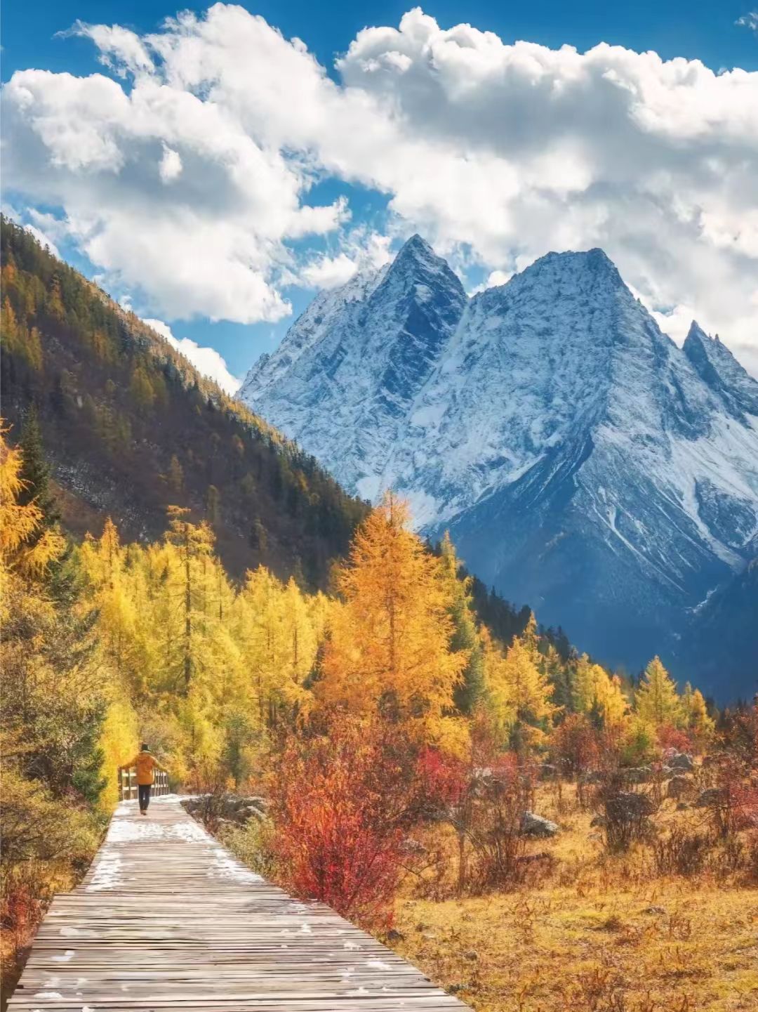 早上指定集合点集合准时出发前往日隆镇(四姑娘山),到达日隆后午餐,午餐后进入双桥沟景区,坐观光车沿途下车游玩,天色渐晚,日落下的双桥沟在光影中更是秋色迷离,景区开阔平坦、景点集中,全程通车。景区虽已开发,但环境维护的出于意料的好,景区内各种服务包括指示也十分清晰明了,大家可以更加舒适、方便的游览整个景区。由于整条沟海拔落差达到一千多米,所以地貌比较丰富,风景也完全值得期待。