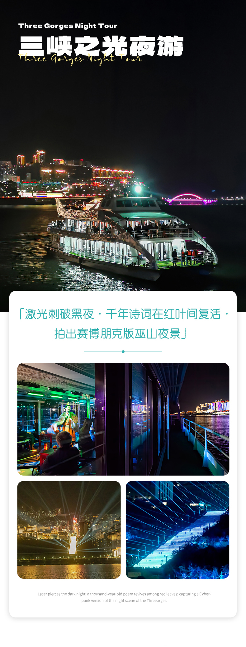 晚上我们为大家安排《三峡之光》夜游,乘坐游船看巫山夜景,大家也可以升级到二楼船舱看表演。