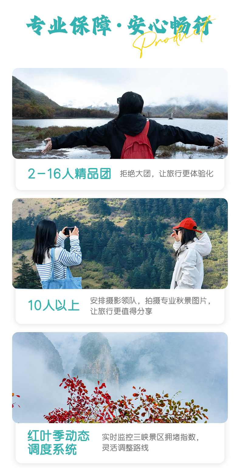 3. 本产品属于秋季产品,秋景确定时间不确定的,正常是11月份秋景,但是也有提前或延后情况,游玩时请合理对待实际景色;