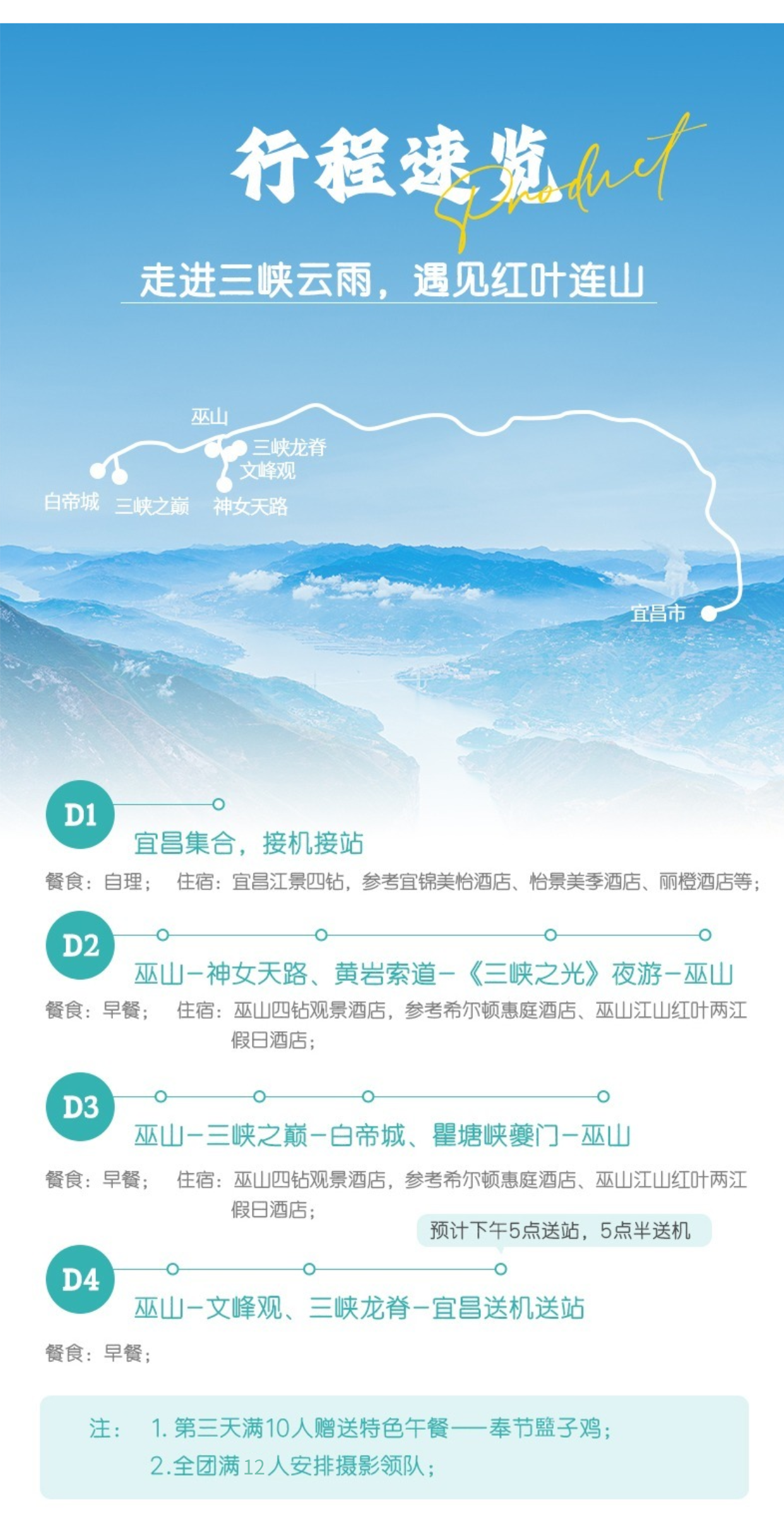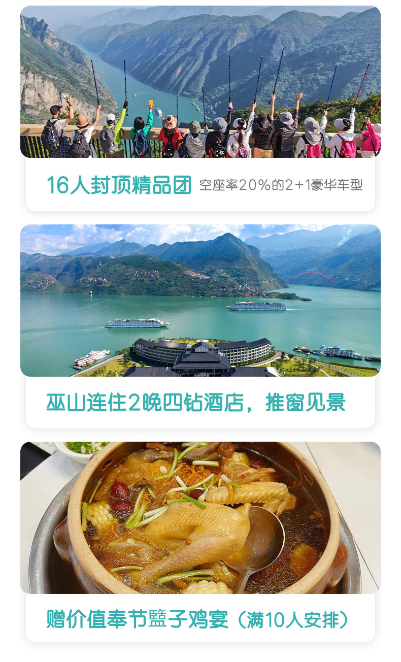 4. 用餐:全程含酒店早餐;满10人赠送奉节盬子鸡特色餐;