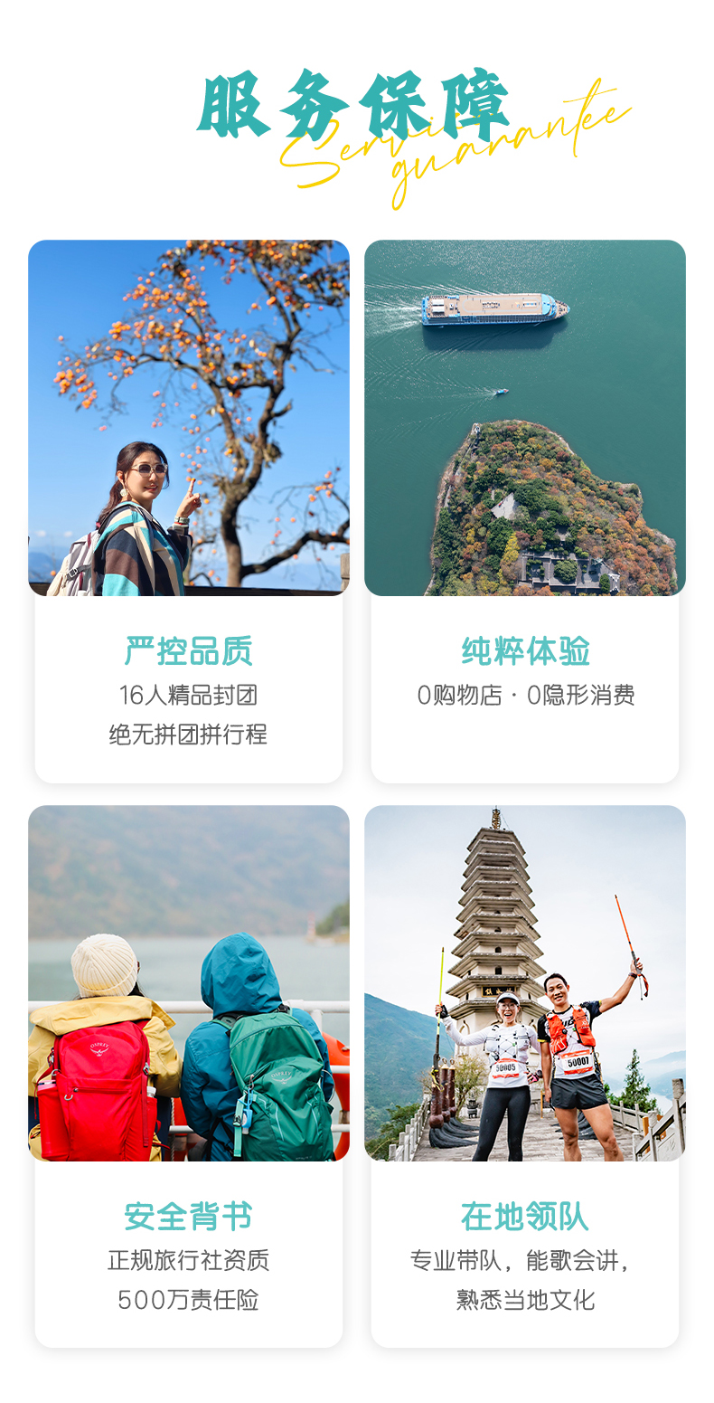 2. 由于此产品游览区域属于巫山、奉节,经济发展缓慢,物资匮乏,旅游资源条件有限,无法与一二线城市旅游资源比较,如遇相关问题敬请谅解