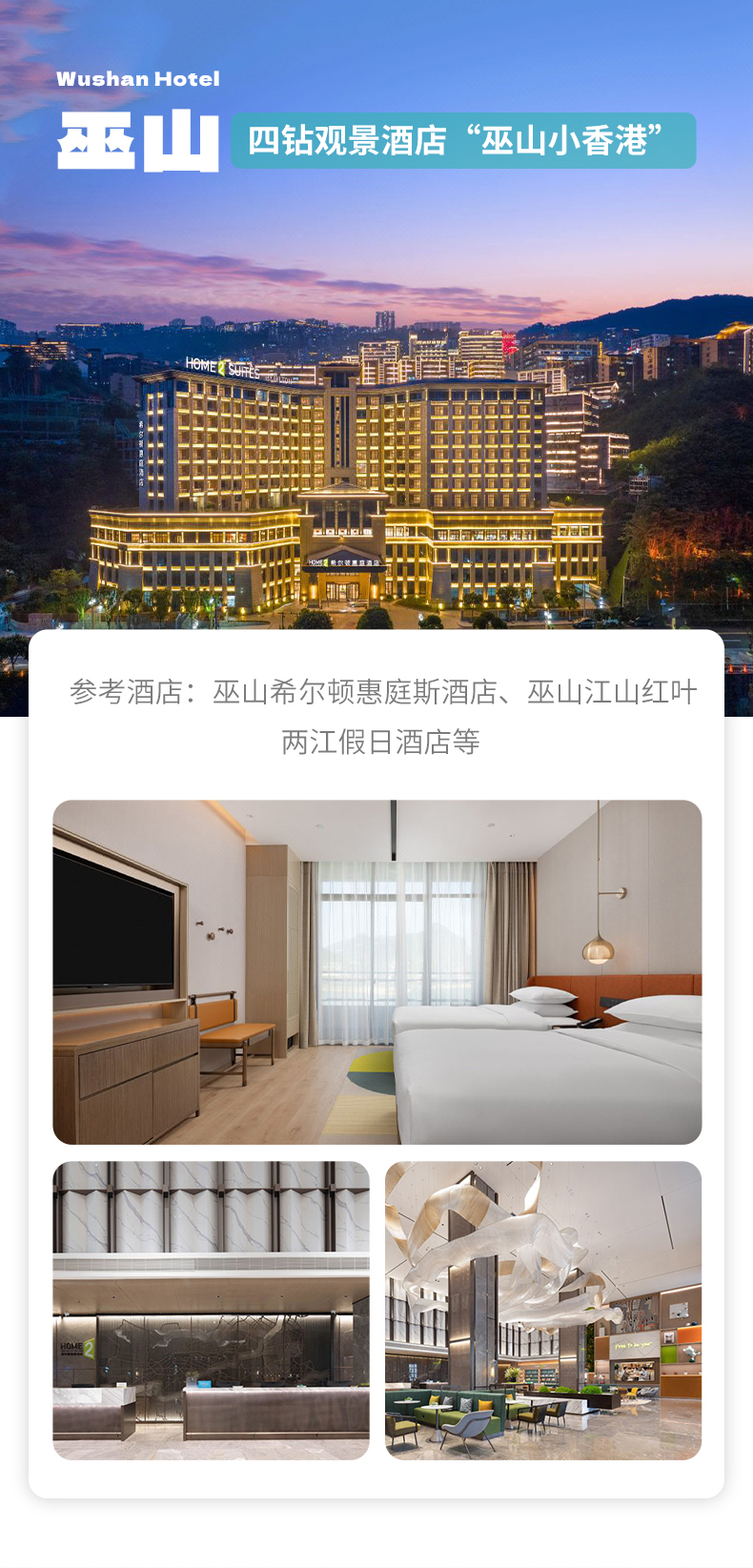 巫山四钻酒店,参考希尔顿惠庭酒店、江山红叶酒店、温德姆酒店等;