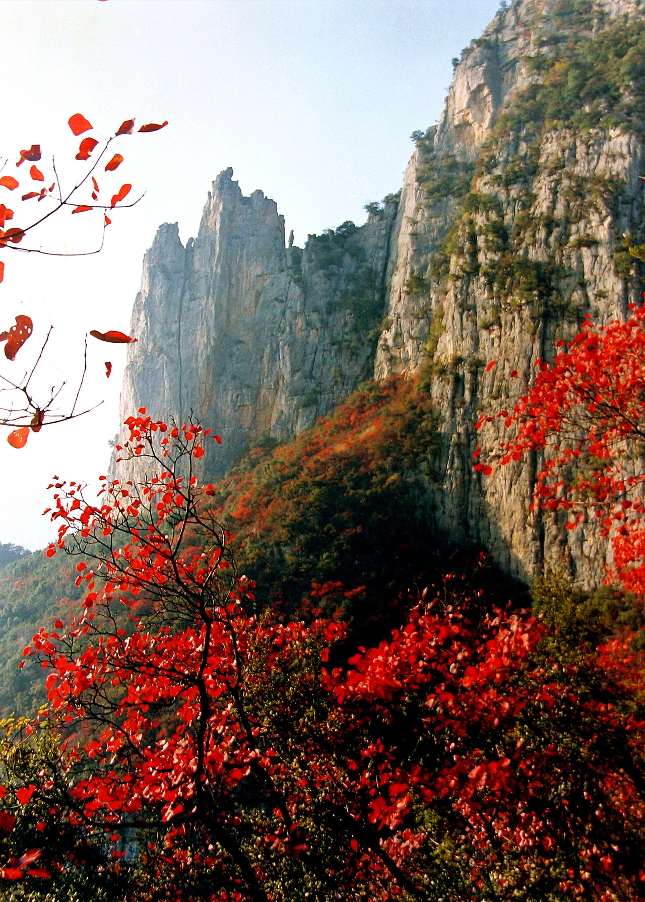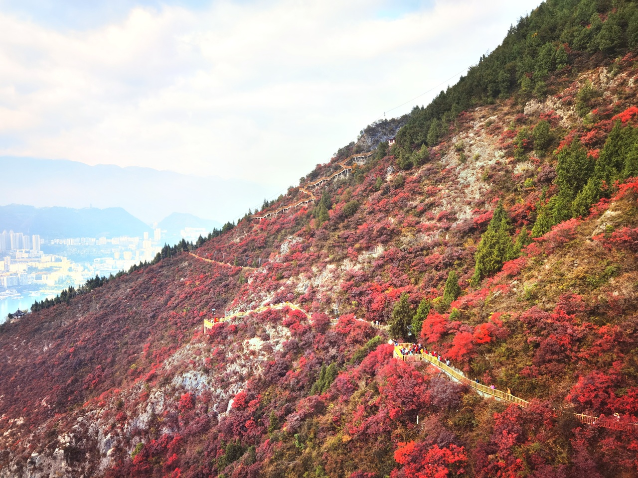 后面我们乘坐黄岩索道下到谷中央,这里的栈道旁,都是连片红叶,远处群山时隐时现。