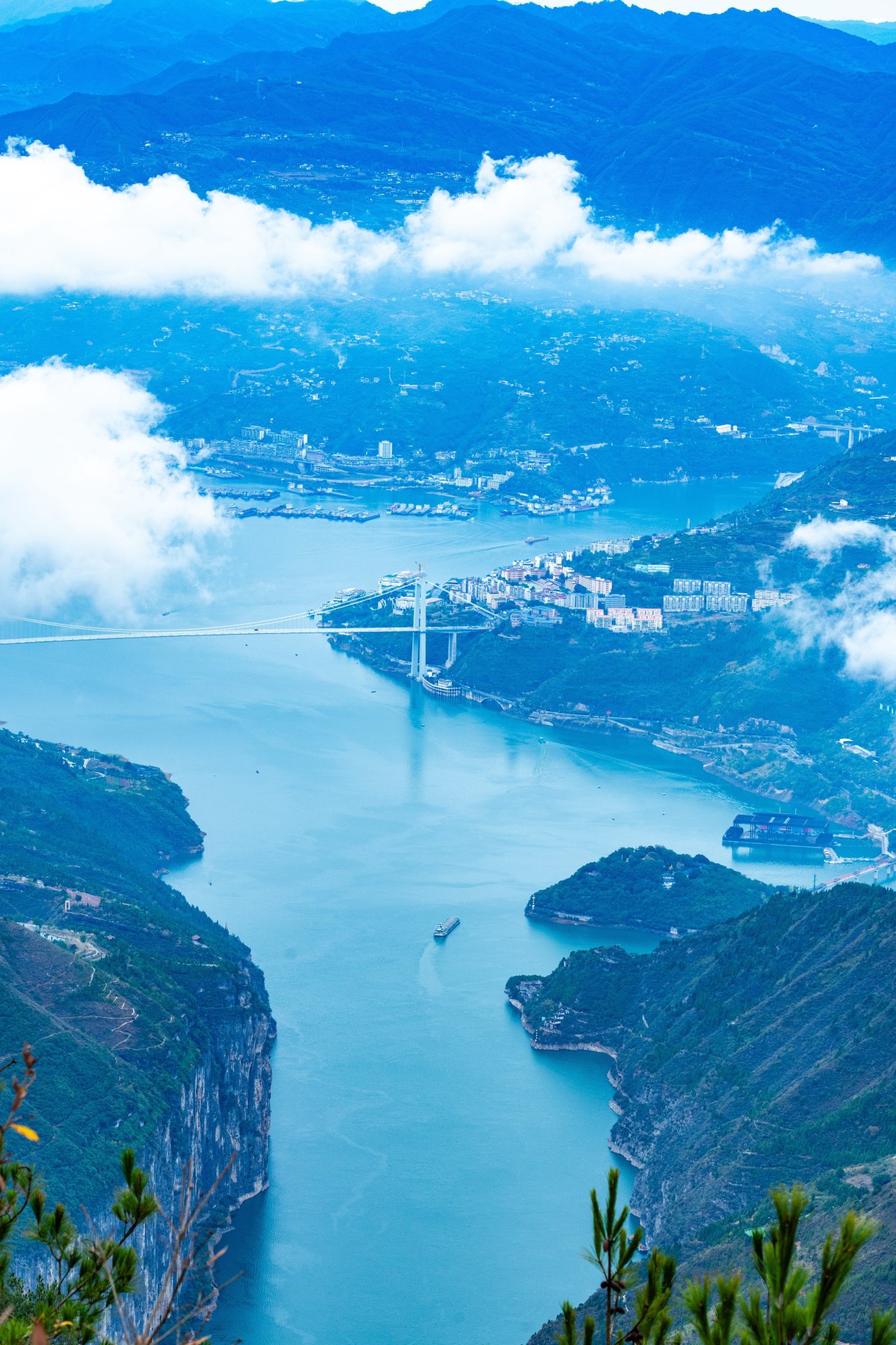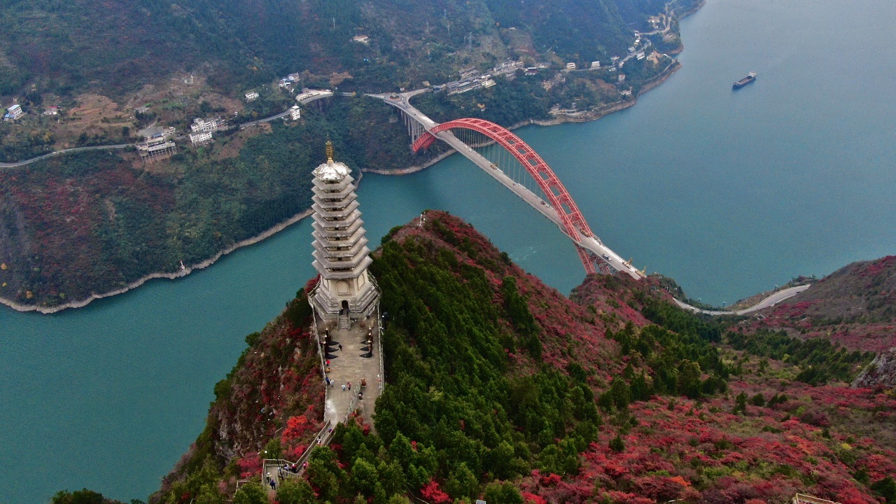 站在文峰观山顶远眺,红叶遍山峦,长江如带、柔润绵长,一江碧水与江山红叶交相辉映,蔚为壮观。透过似火的红叶,俯瞰巫峡口彩虹卧波,“一桥飞架南北,天堑变通途”。远眺巫山县城依山层叠,江与城风情如画,让人顿生江山豪情。