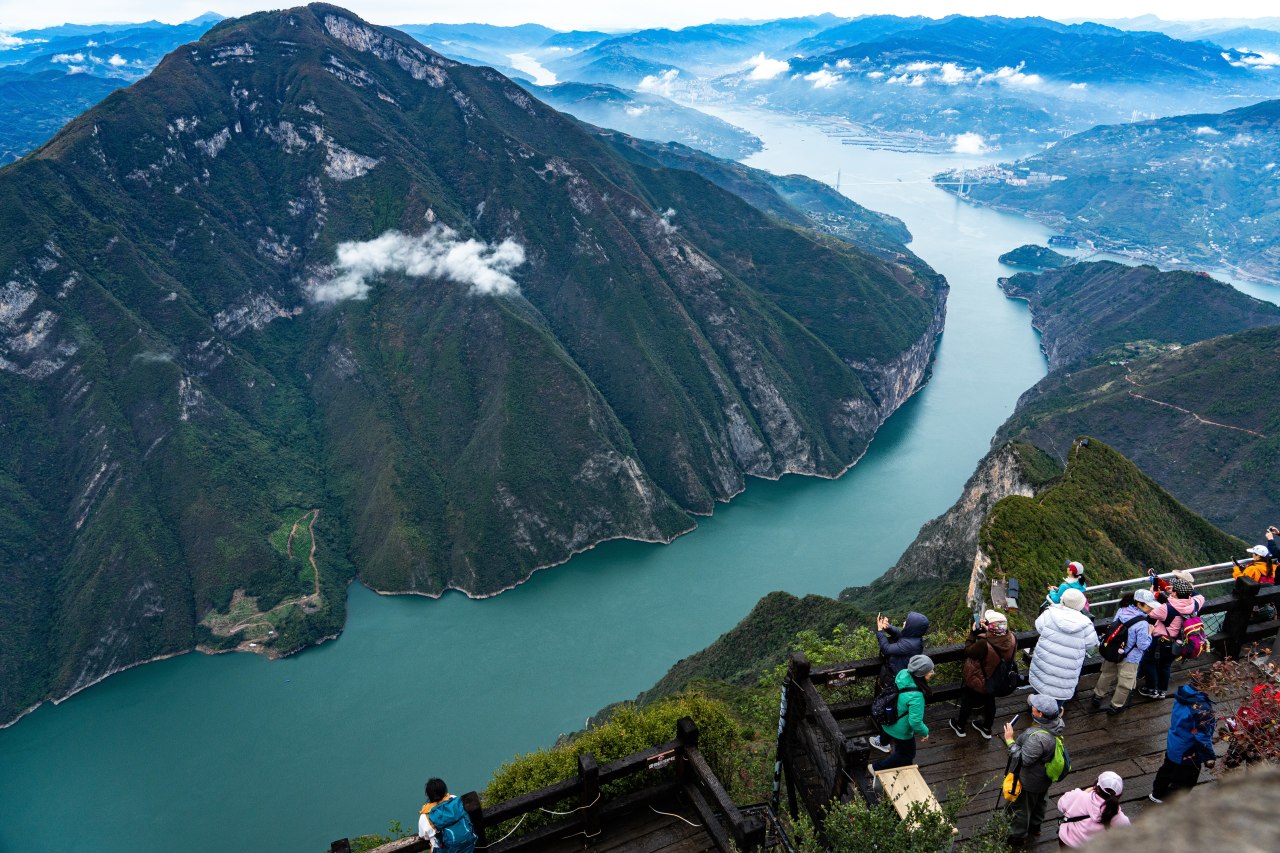 立长江脊梁之巅,1388米云台尽染赤焰!瞿塘峡八百里江山化作熔炉——夔门为炉口,赤甲山为薪柴,秋霜一点,漫山黄栌、枫香、乌桕轰然燃烧!登临处,江流如碧带蜿蜒,游船似金梭穿行,而脚下千峰叠嶂,正以最炽烈的红向苍穹献祭。