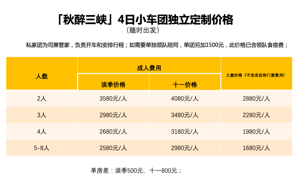 2. 单房差:本路线无自然房差,如需单住提前告知客服,需补单房差500元/人;如在集合日或行程中临时需要单住,则需要补一间房间的费用(单房差*2); 一大一小报名需要补单房差,住宿1间房;