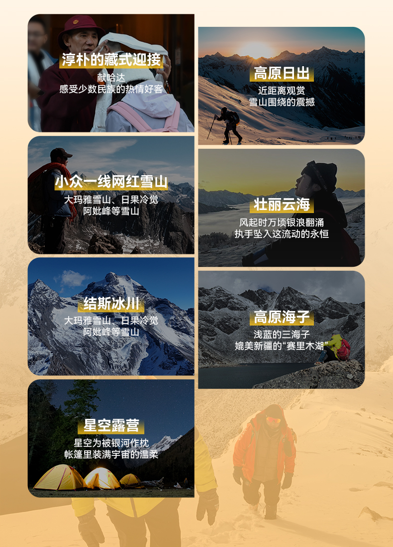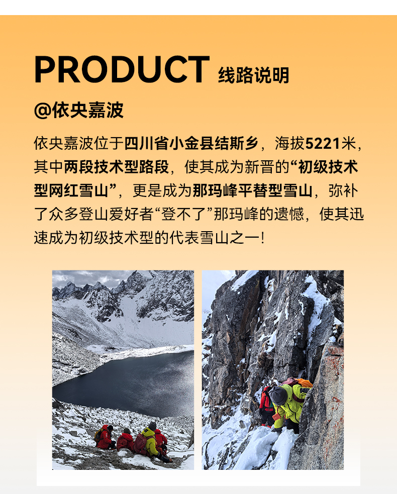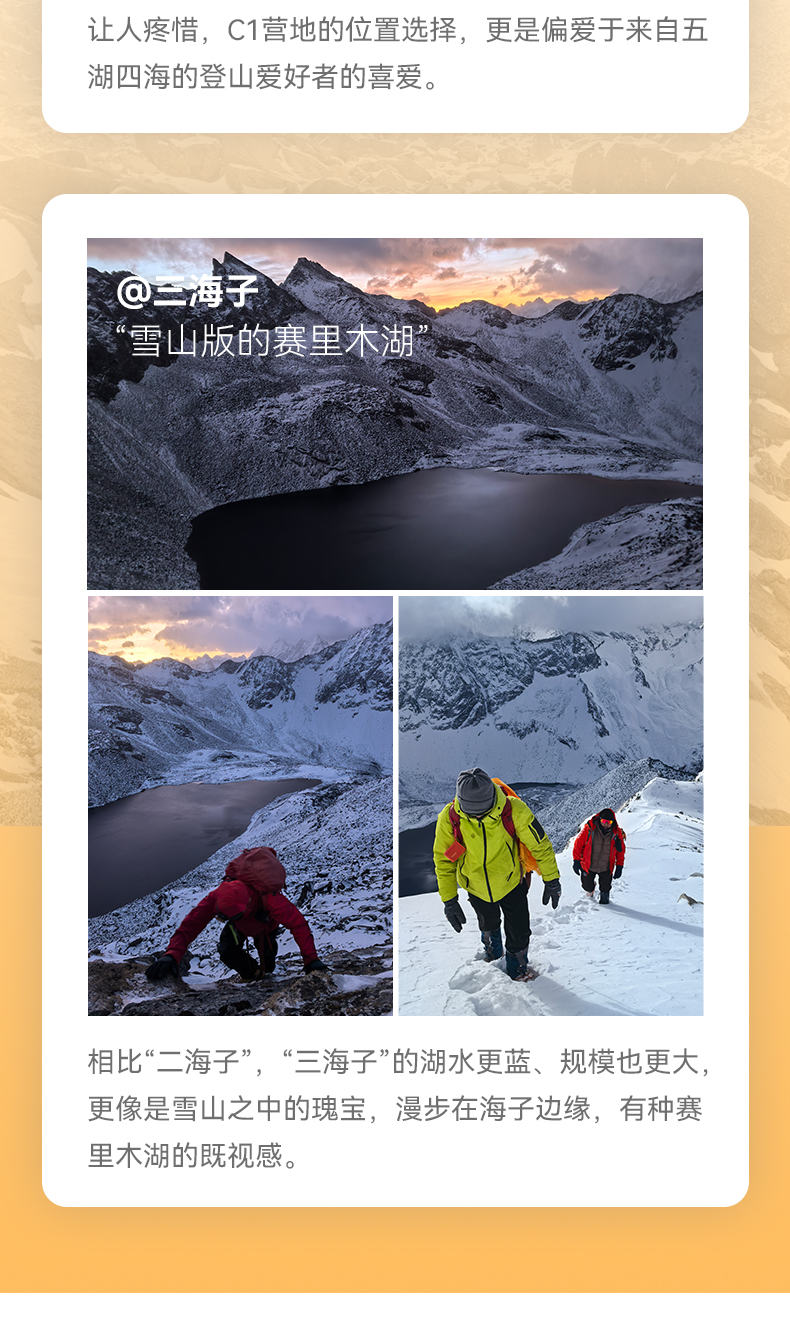 行程概览:今天是艰苦的一天,C1营地-依央嘉波峰顶只有约3km,但是爬升是在900米-1000米,强度较大,我们从凌晨三点左右(参考时间,具体以当团领队或者向导出发时间为准)出发,先是到达“雪山版的赛里木湖”——三海子,之后的路段以乱石堆为主,开始不停的向上爬山,第一技术路段海拔约4780米,第二技术路段海拔约4963米,在向导或者领队的带领之下,攻克这两个难点之后,就开始最后的冲顶一段。登山,是一个享受的过程,也是对身体的一个考验,只有到顶后才能体会“会当凌绝顶,一览众山小”的意境,不光是对精神层面的补充,更是对视觉层面的巨大冲击。享受过后,沿着山体的另一侧开始下山,直接到(三海子)湖边,开始享受这一刻三海子带给你的宁静!最后回到大二普大本营,到结斯乡酒店,梳洗一番,开启我们的庆功宴,也是对充实的一天进行分享和回味,再次庆祝大家登顶成功的喜悦!