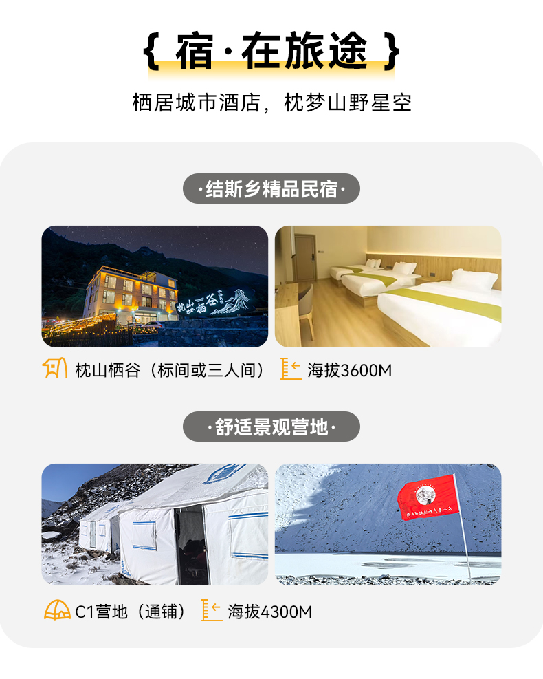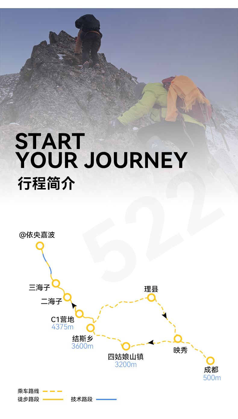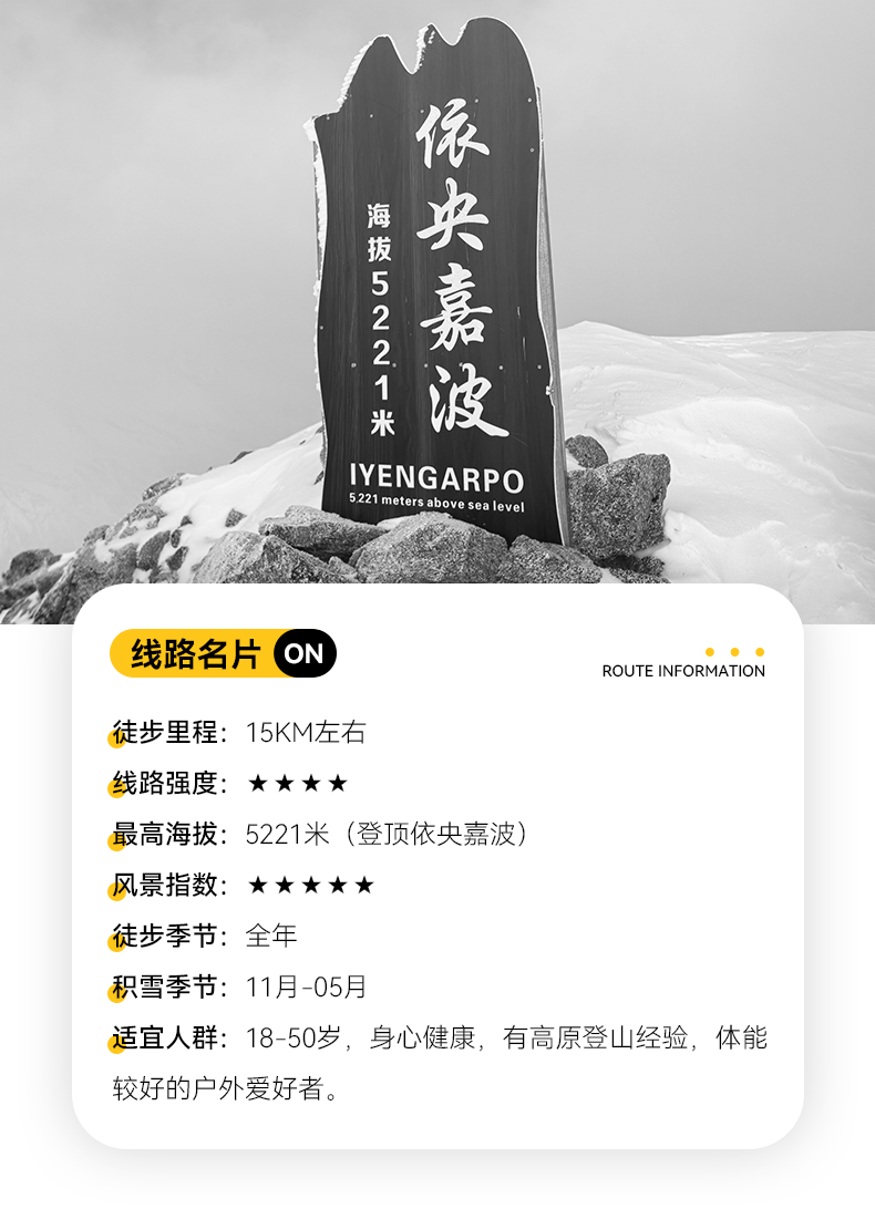 ▷ 海拔:依央嘉波峰顶约5221m,大二普大本营约3890m,结斯乡酒店约3600m