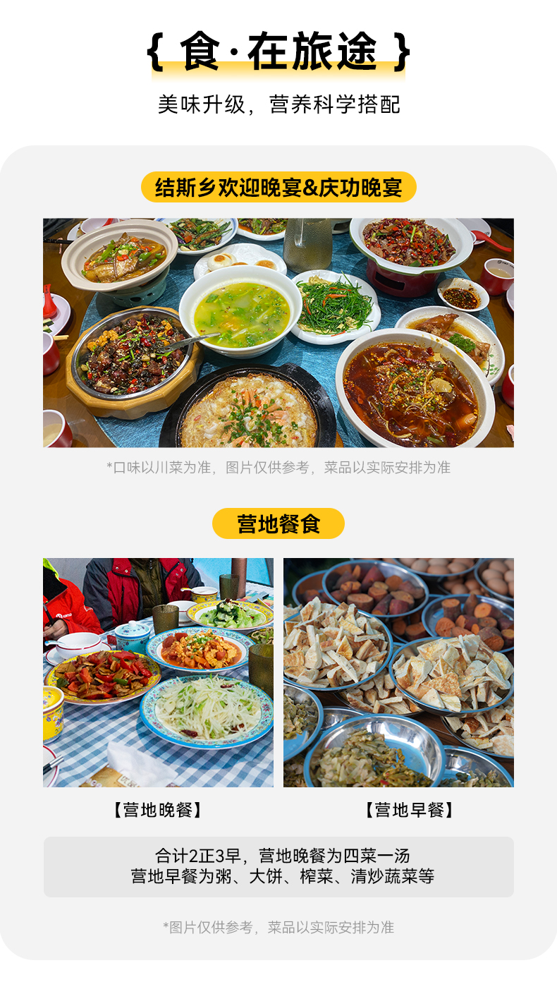 3.餐食:全程所列餐食合计2正3早,包含营地早餐、晚餐。营地晚餐为四菜一汤,营地早餐为粥、大饼、榨菜、清炒蔬菜等。