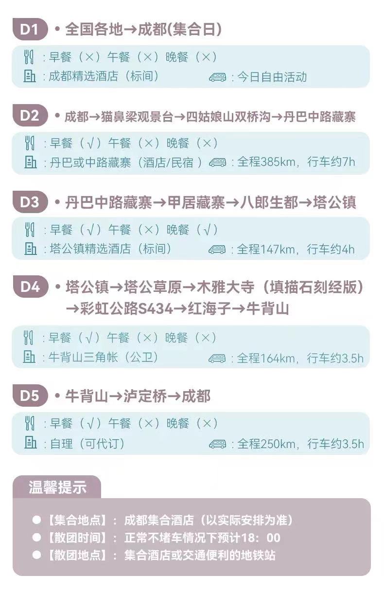 第5天成都散团,正常情况下约18:00返回成都,由于川西地区路况较差,山道狭窄,有可能因为堵车而发生延误,建议大家预定第二天返程的航班/车次离开。