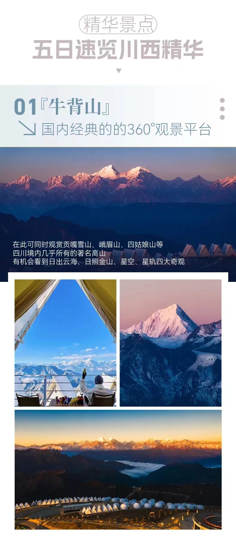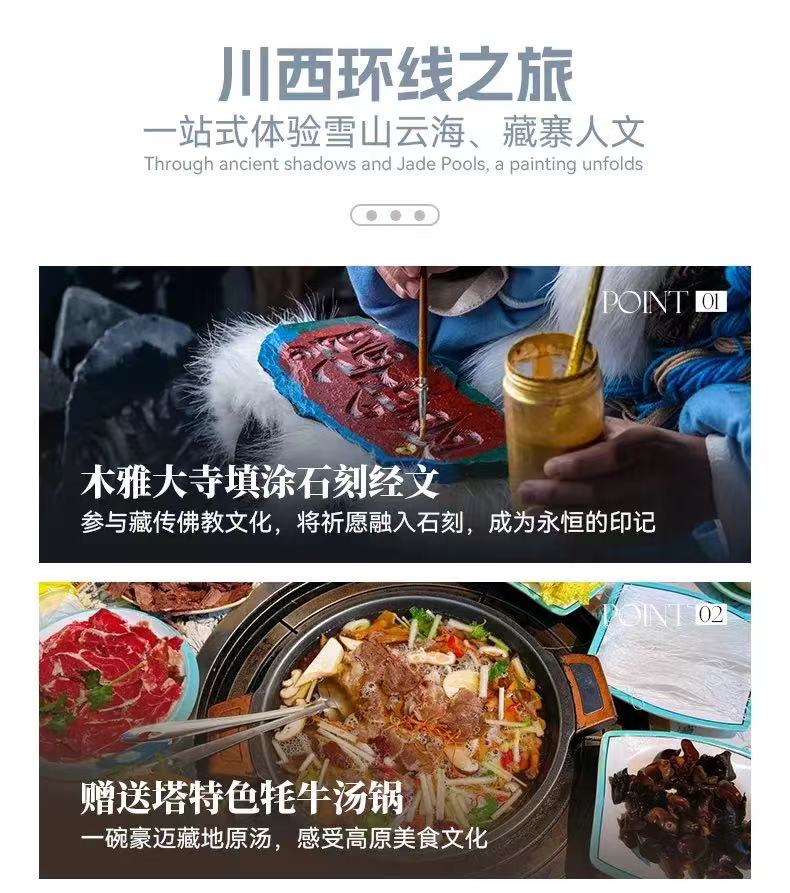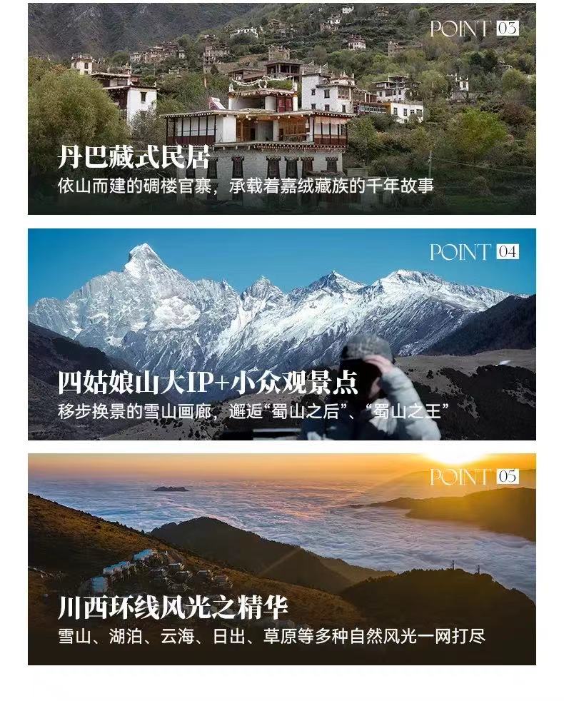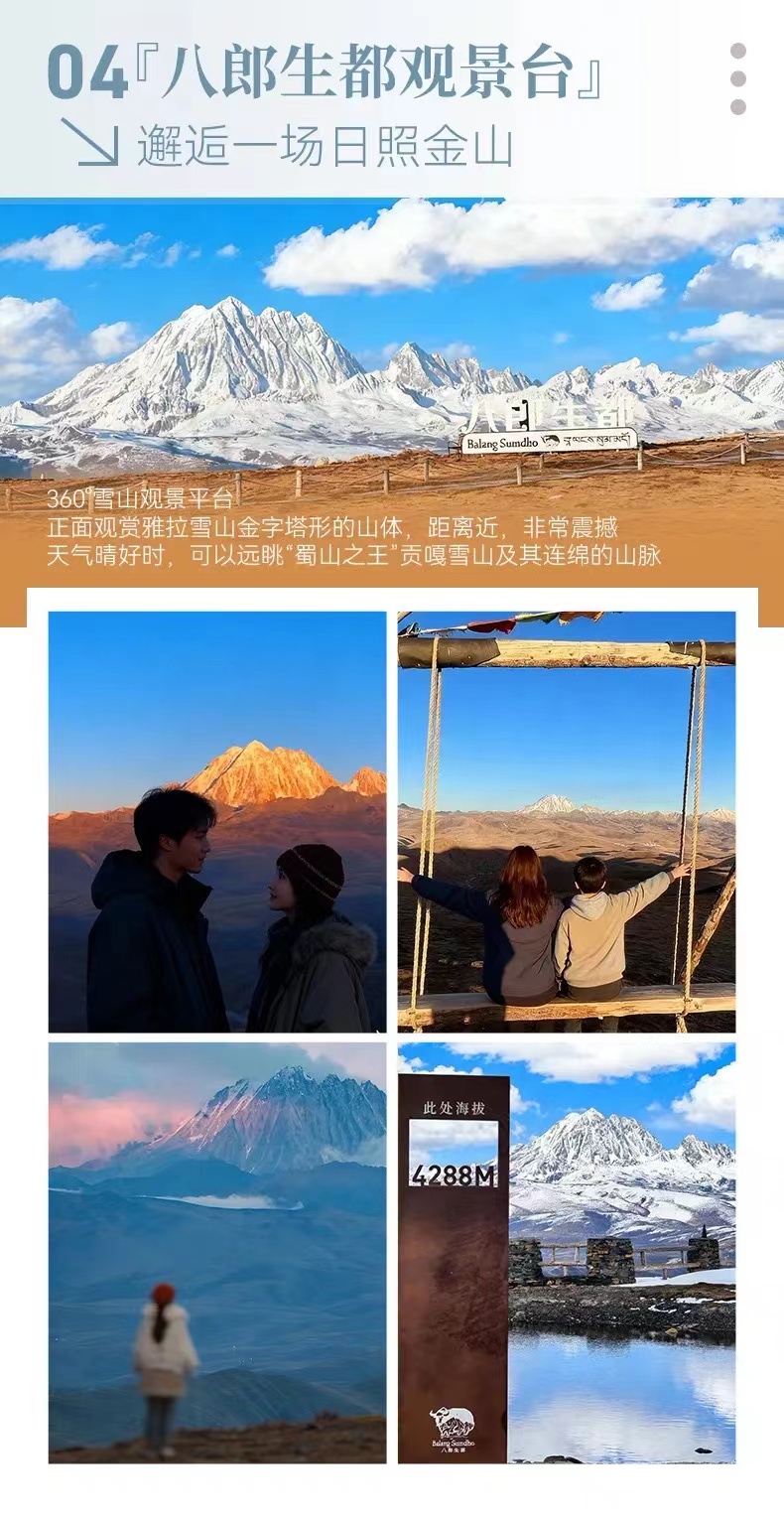 在"八郎生都"和"牛背山"两个顶级观景台,多角度,近距离欣赏雅拉雪山,贡嘎雪山群峰的日出与云海,将雪山体验推向高潮,入住"中路藏寨",体验原生态嘉绒藏族风情,安排"木雅大寺填描石刻"互动环节,从"参观者"变为"短暂参与者",深化文化连接;在5天内高效串联川西"雪山,草原,藏寨,云海,人文"五大核心要素,让您深度感受川西的壮丽与深邃。