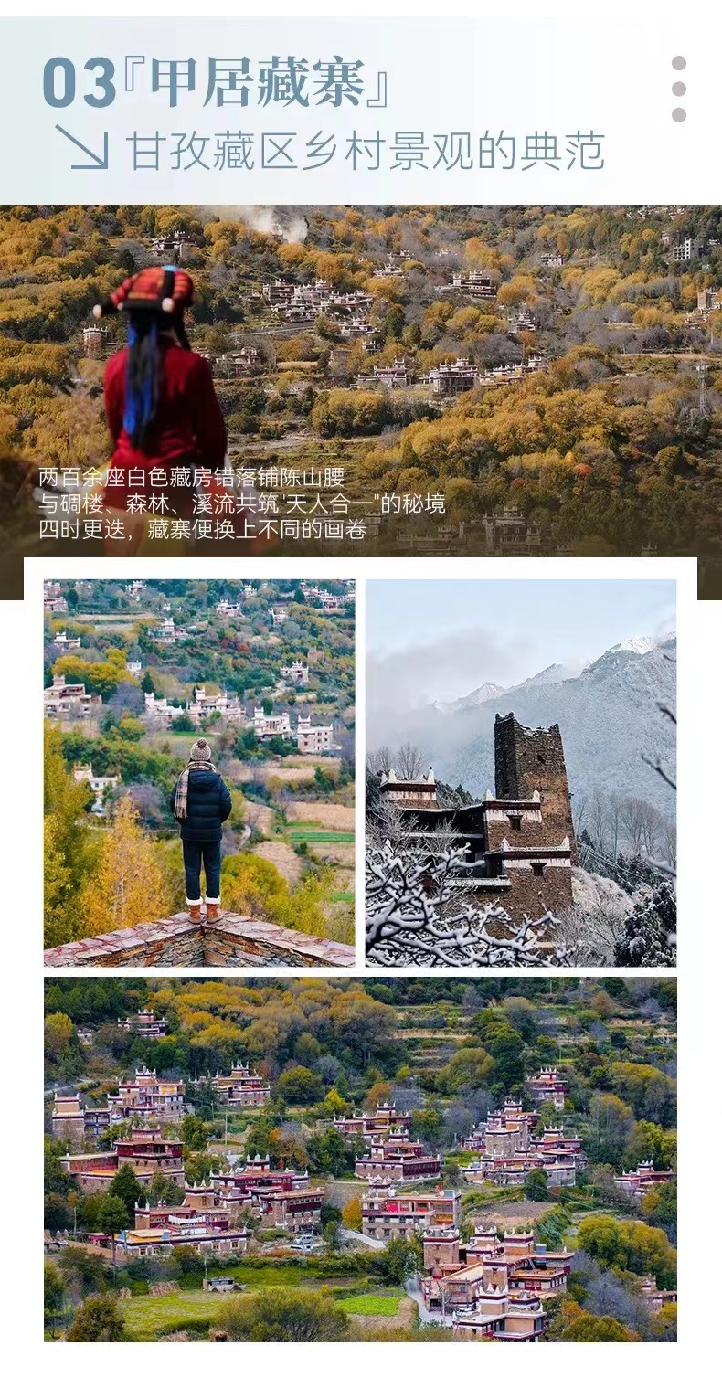 行程概览:我们常说“穿百家衣,吃百家饭”,给家人祈求平安长寿,而“甲居藏寨”所谓“甲居”,藏语亦是百户人家之意。整个藏寨从大金川河谷层层向上,一直延伸到卡帕玛群峰脚下,星罗棋布,错落有致,它隐藏在高山峡谷中,沿山势层层叠叠很有章理,充满美感。其碉楼、藏寨、东女文化、墨尔多神山等旅游资源最具代表性,今天,让我们一起去探索这个云中的藏寨吧!日落之前,我们乘车前往另一个小众的360度的观景平台八郎生都,邂逅一次绝美的日落,晚上抵达塔公酒店入。