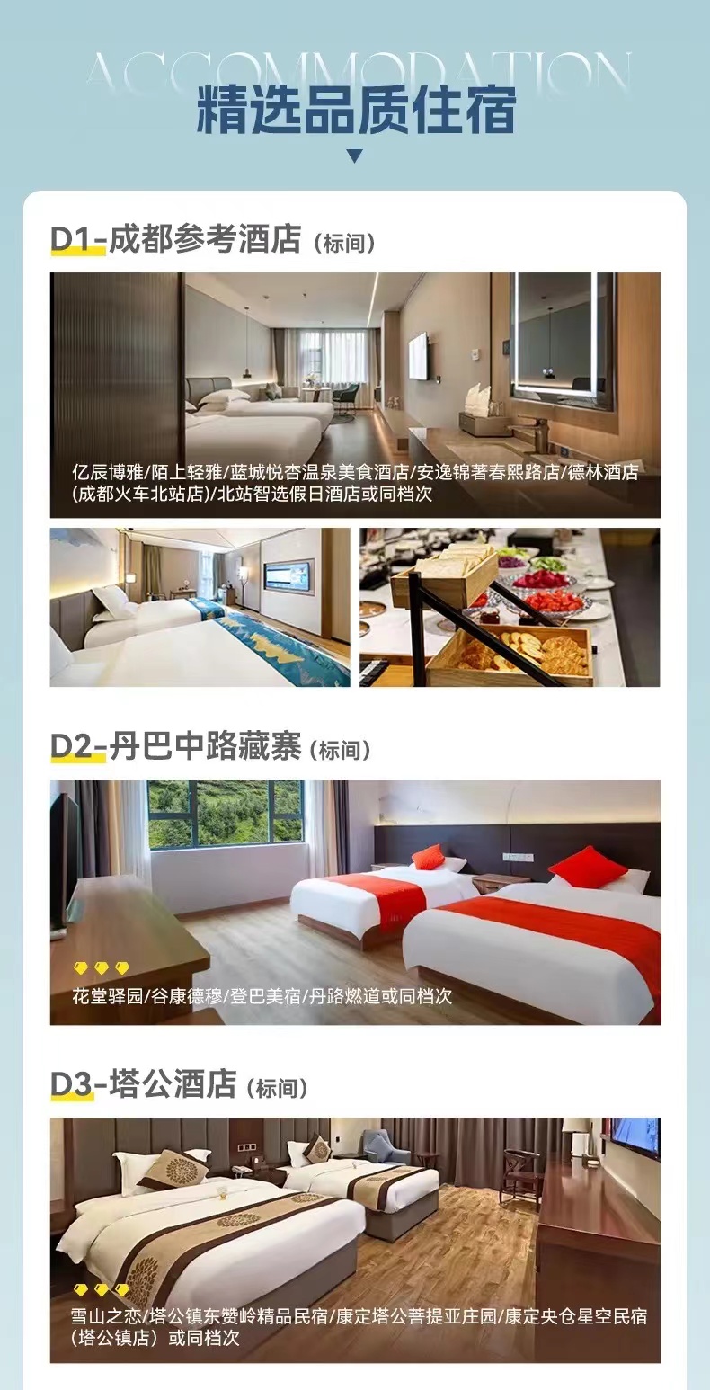 第1天成都集合-(指定酒店),酒店入住时间14:00后,提前抵达可将行李寄存在酒店前台。