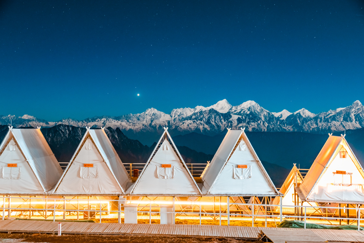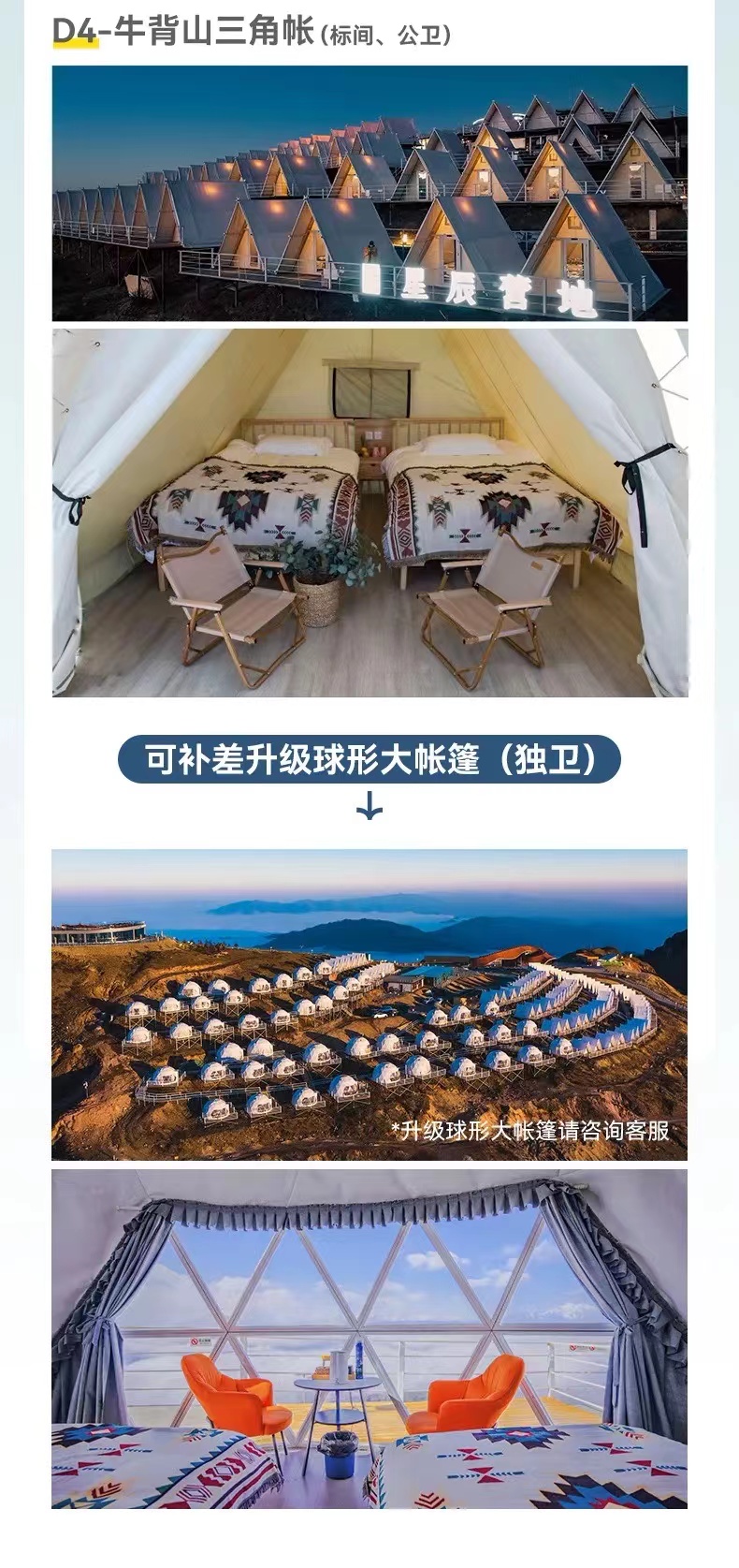 1、牛背山住宿可升级球形大帐篷独卫,如帐篷酒店满房的情况,我们则安排至:牛背山星铂酒店box房型,标间独卫。