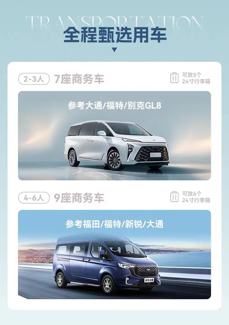 1、交通:全程包车往返,根据人数选择合适车型。