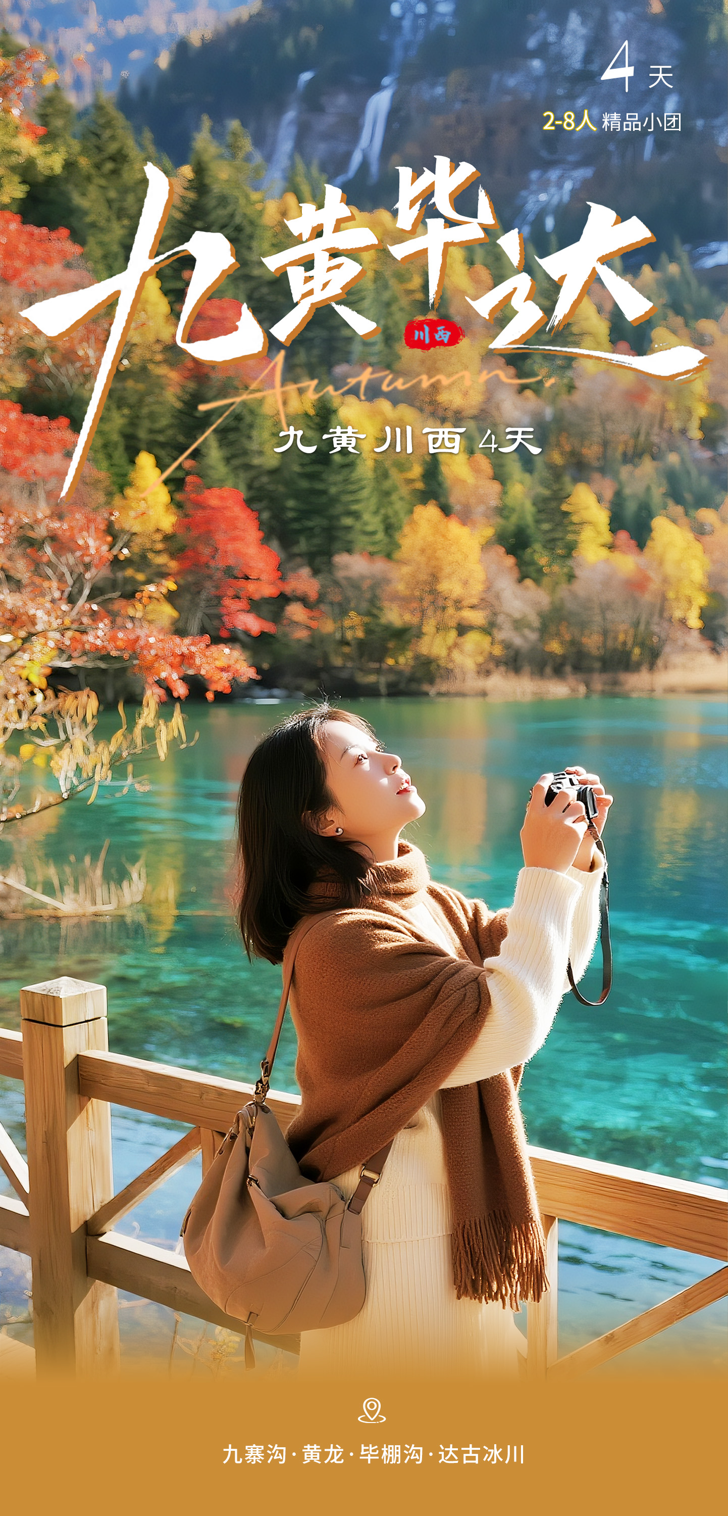 九黄毕达是每年阿坝秋冬的人气首选线路,从毕棚海子到达古冰川再至九寨黄龙的水,这四个景点能让你感受到川西雪山彩林季的不同风貌,小团的配备也非常灵活,从朋友似旅行到多个可升级的住宿选项,整体就主打一个耍的舒心。