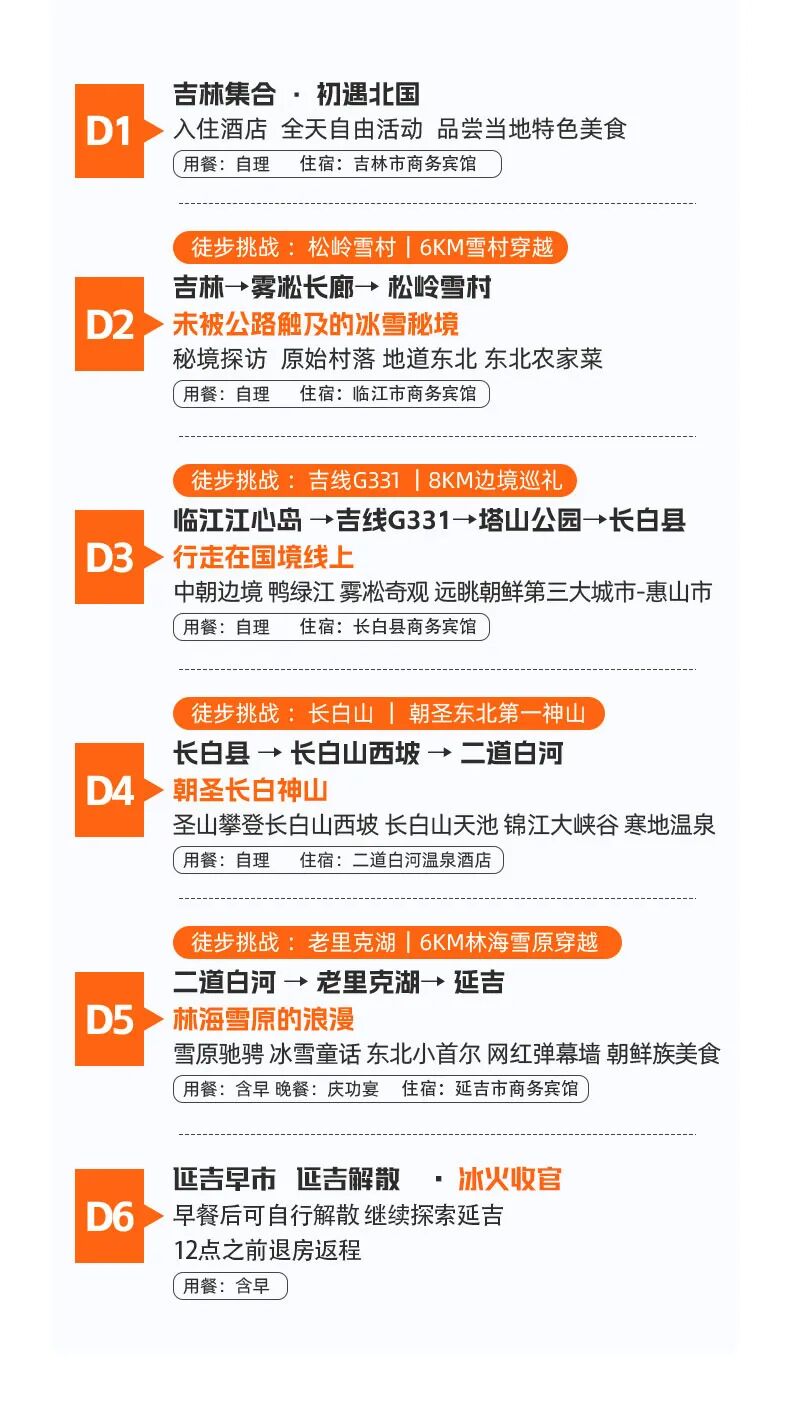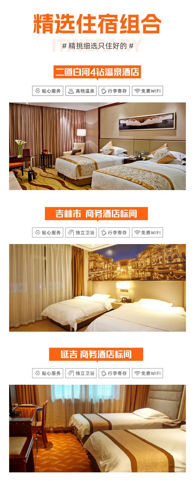 长白山景区由于冬季旅游人数较多、景区限流、提前15天预约等因素,团队参观时间严格执行预约时间游览,景点参观顺序按照预约时间进行调整,如未能预约到长白山景区门票或当天临时闭园,我司将调整徒步穿越“长白山原始森林”(门票及车程相抵扣无差价退还)