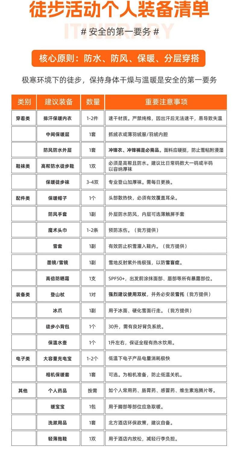 本行程涉及中等强度徒步(单日最长8km),高血压、心脏病患者及行动不便者请勿报名。