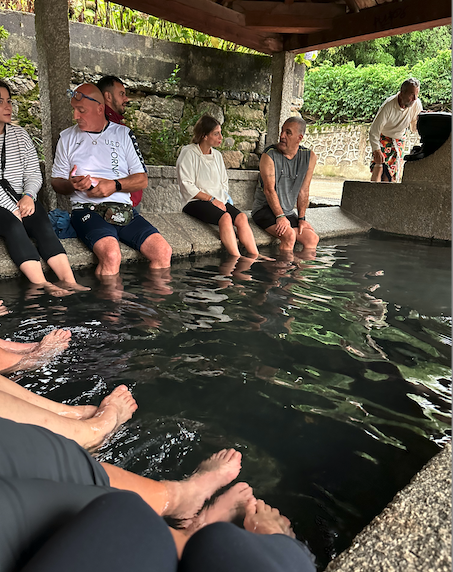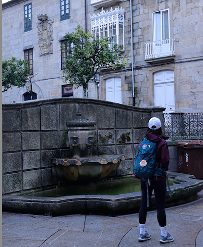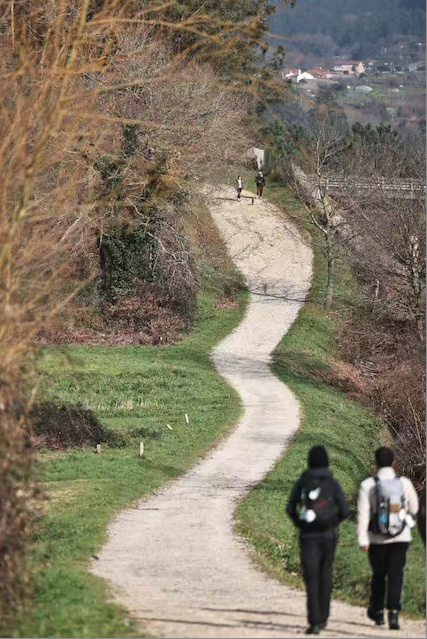 穿过浅滩之后,路线缓缓引领我们走入加利西亚的乡村腹地:圣玛丽亚·德·阿尔巴(Santa María de Alba)和塞尔彭宗斯(Cerponzons)等宁静村庄点缀在林间与田野之间,风景逐渐由石墙与老屋构成的街景,转为林荫夹道、溪流潺潺的绿意之路。最终,抵达今日的目的地——雷耶斯温泉镇(Caldas de Reis)。这是一个由乌米亚河(Umia)与贝尔马尼亚河(Bermaña)滋养的小镇,自古因天然温泉而著称。在小镇中心,不妨将双脚泡入免费开放的温泉池中,让天然泉水为一路的疲惫洗去尘埃,迎接明日旅程。