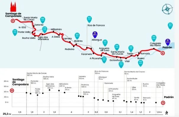 随着脚步前行,周围的乡村景色愈加丰富,预示着我们离圣城圣地亚哥孔波斯特拉的终点越来越近。今天的路线从帕德龙出发,途经宁静的特奥(Teo)和阿梅斯(Ames),最终抵达目的地。