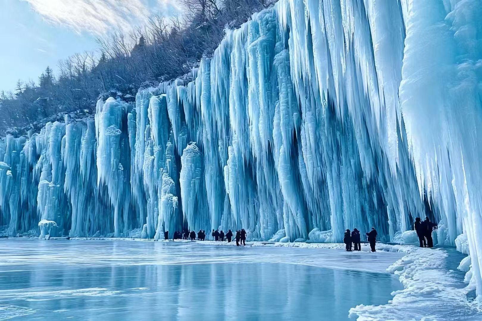 从崖顶垂落的冰瀑宛若冬神的雕塑。