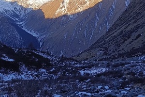 ▶木尔寨沟口,之后换乘当地中转车到徒步起点开始徒步,我们沿着蜿蜒的溪流而上,道路两旁古老的沙棘树宛如一棵棵天然的盆景,偶尔窜出的牦牛仿佛在宣示谁才是这片森林的主人,几天的坡度比较缓,适应海拔的同时也可以找一找自己的节奏,为明天的冲顶做准备。