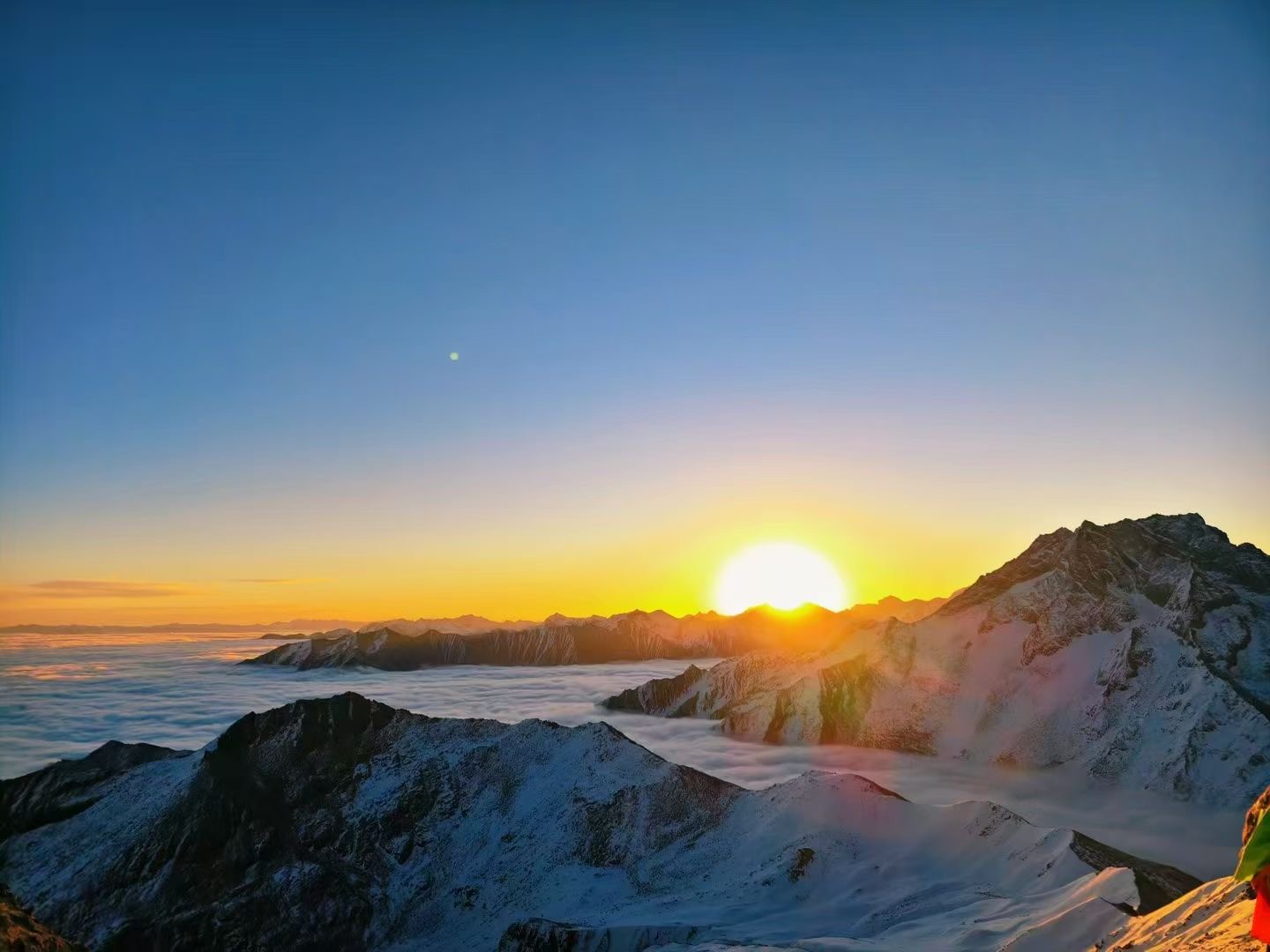 ▶大约在日出前后我们抵达山顶,远山如黛,这里可以远眺四姑娘山群峰,在峰顶停拍照后我们开始返程(由于山顶暴露感强,我们停留大约10分钟左右,向导根据具体天气情况做调整。)抵达大本营后徒步返回徒步起点,乘车返回成都。