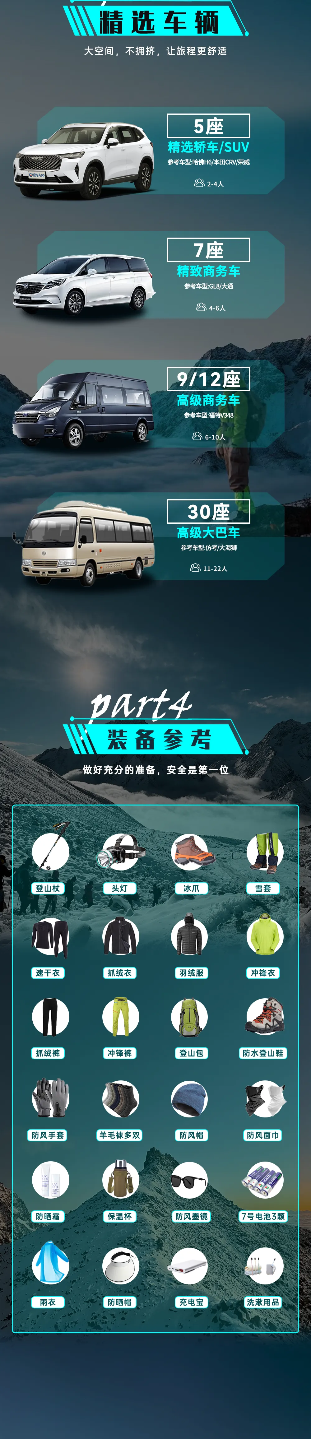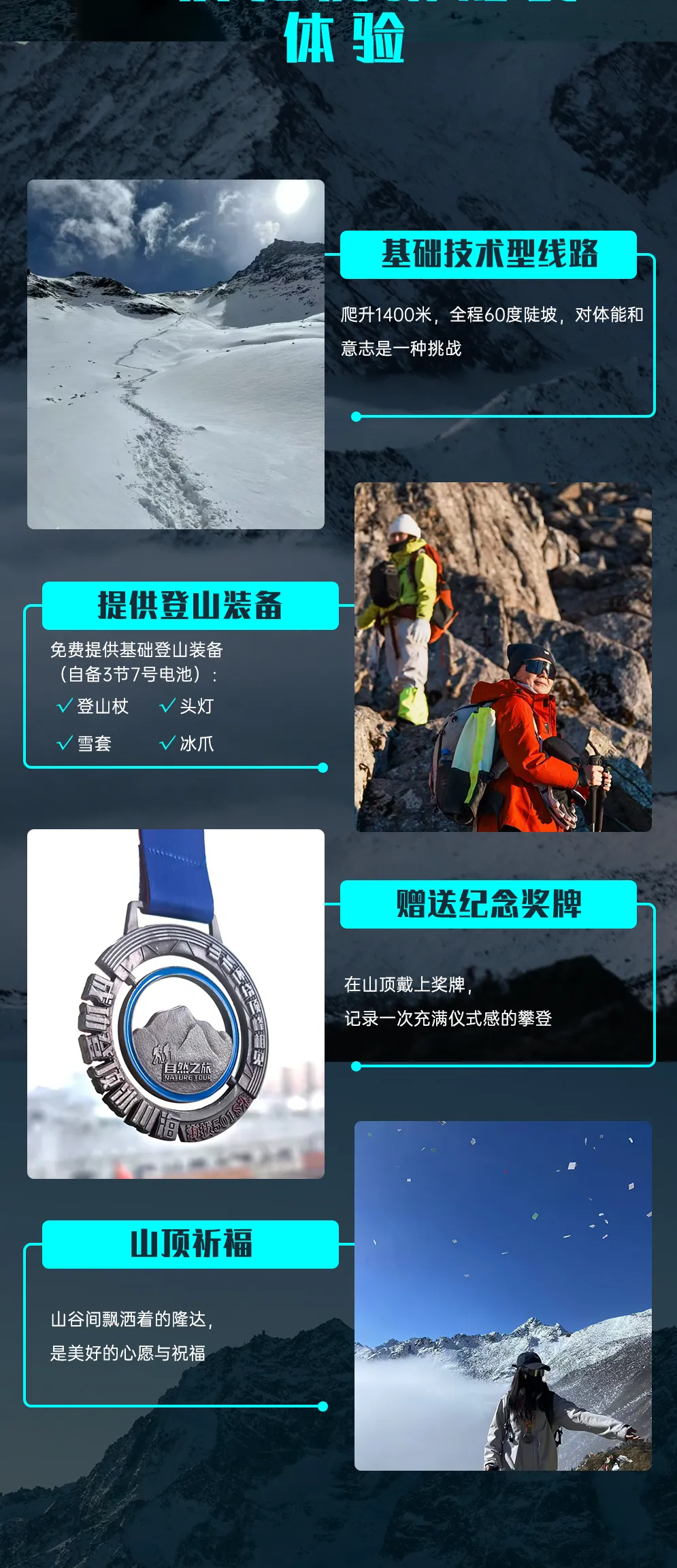 提供装备使用:冰爪+雪套+登山杖+头灯(需自备3节7号电池)。