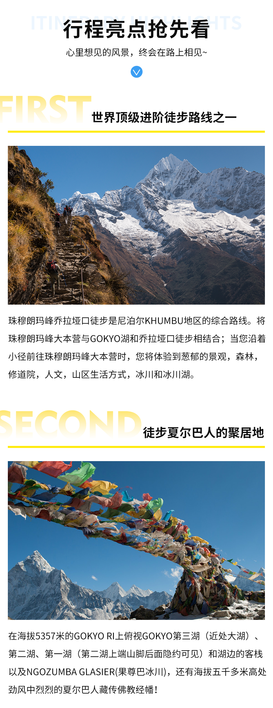 行程概览:上午自愿原则,有兴趣的可去徒步第四、第五湖,中午左右返回,也可以在第三湖附近转转,或者发呆,欣赏风景。Gokyo村吃午饭,下午我们出发前往EBC最重要一个观景平台Gokyo Ri,在Gokyo-Ri可以观赏到【卓奥友、珠峰、马卡鲁、洛子峰】,非常壮观!大约2小时左右到达山顶,这里是四大8000米雪山全景最佳观察点,我们等待日落,天气晴好我们可以看到非常壮观的日落,之后我们下山返回住宿地,大约1.5小时到达村子。徒步需要4小时。
