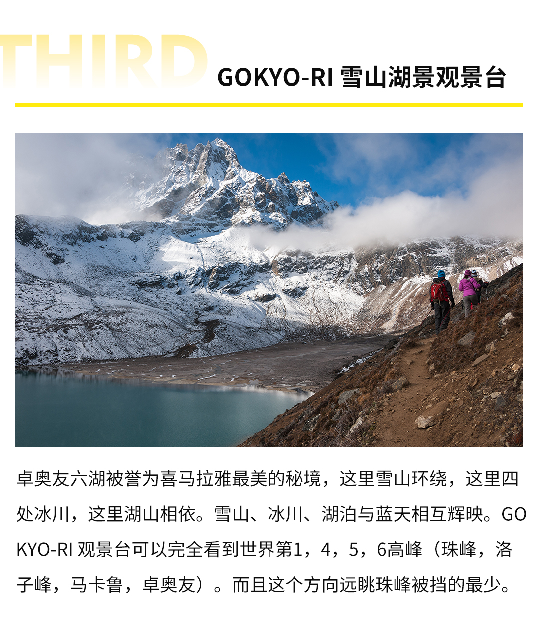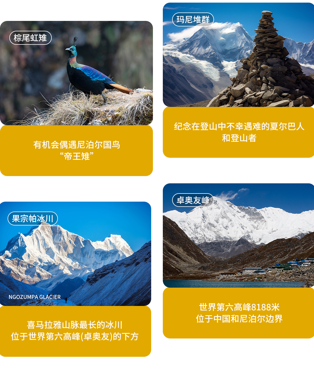 行程概览:经过昨天,可能大家都有些累了,上午我们穿过Ngozumpa Glacier冰川,抵达Gokyo村住宿。Gokyo村是昆布地区第二高住宿点,村子紧挨着Gokyo第三湖,卓奥友峰倒影在湖面。下午我们在此休整下,可以晒晒太阳,欣赏美景,晚上的星空也是不容错过的美景。