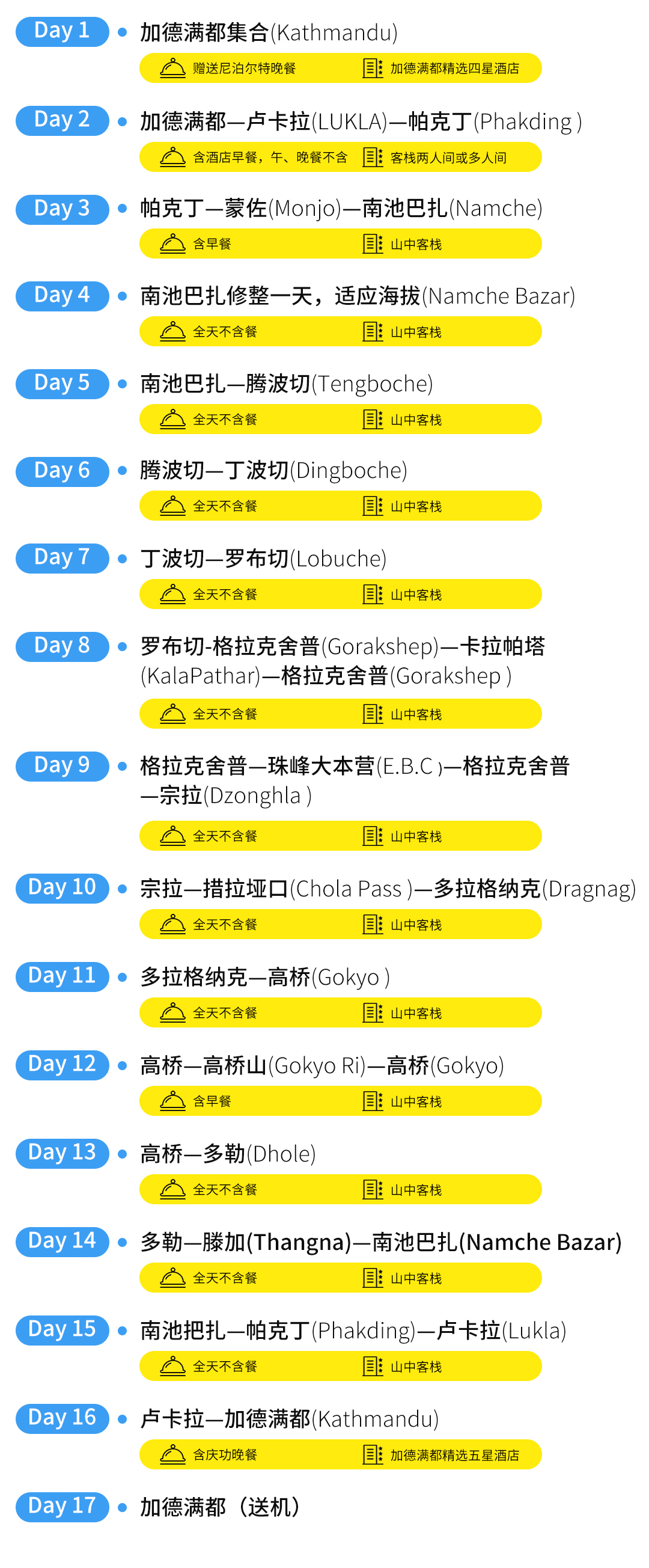 行程概览:早餐后出发,今天开始就进入了雪山王国的世界,天气晴朗的情况下,可以看见珠峰、洛子、阿玛达布朗群峰,运气好的话甚至可以看见在路边的尼泊尔国鸟—帝王雉,期间有一段600米的连续上坡。