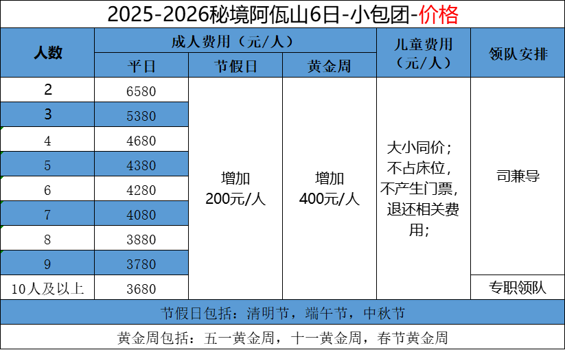 4、单房差800元/人(春节单房差1200元/人),队员指定住单间,需提前告知领队,并补齐房差,无自然房差,单男单女可放心报名;