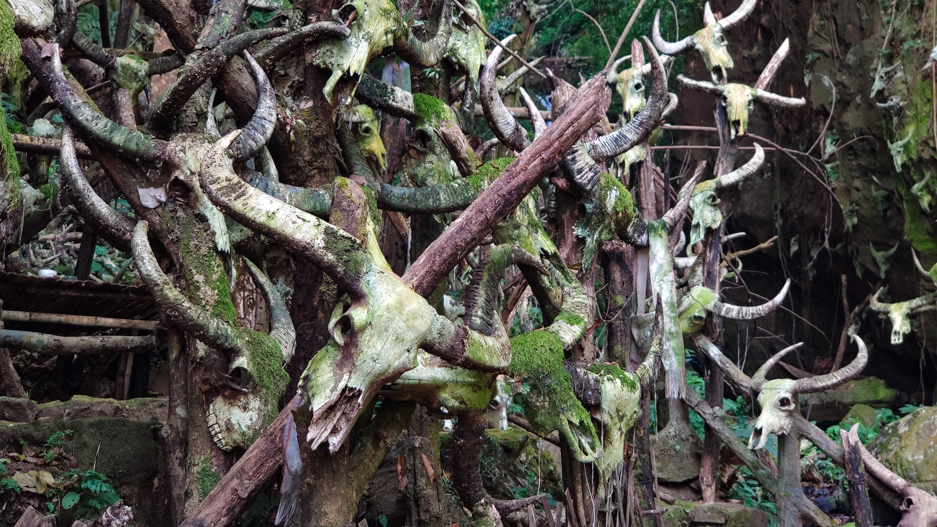 走进古老而神秘的【龙摩爷圣地】。佤族信奉天万物有灵的原始宗教,数百年的祭祀活动中,日积月累的数千牛头,岁月沧桑的人头桩,神秘的朝拜台,无不让人为之震撼。
