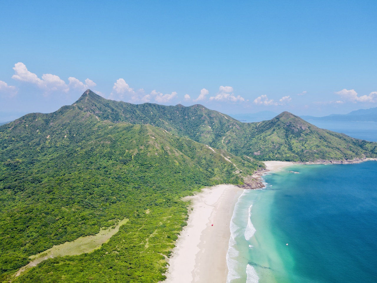 这里水清沙幼,于群山之中,被喻为“西贡半岛的明珠”西湾沙滩中央位置有一石排,将沙滩分成左右两滩,浪接浪接续而来,极目海天接成一线,海风不止,阳光灿烂。
